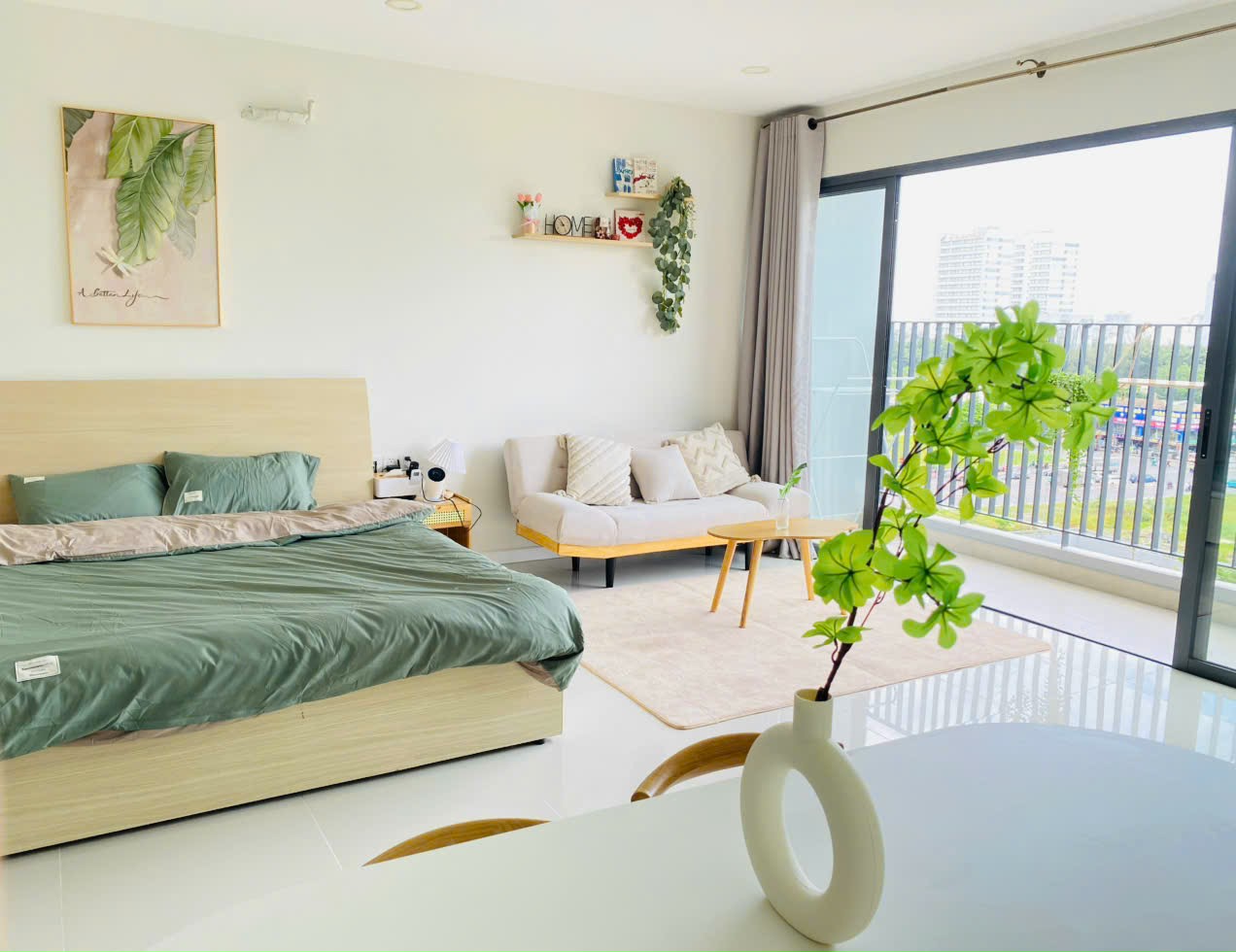Ban công của homestay cũng là một không gian đáng yêu không kém, thoáng mát và tràn ngập ánh sáng tự nhiên. Đây là nơi lý tưởng để bạn nhâm nhi ly cà phê buổi sáng, đọc sách, làm việc hoặc đơn giản là tận hưởng không khí trong lành giữa thành phố.