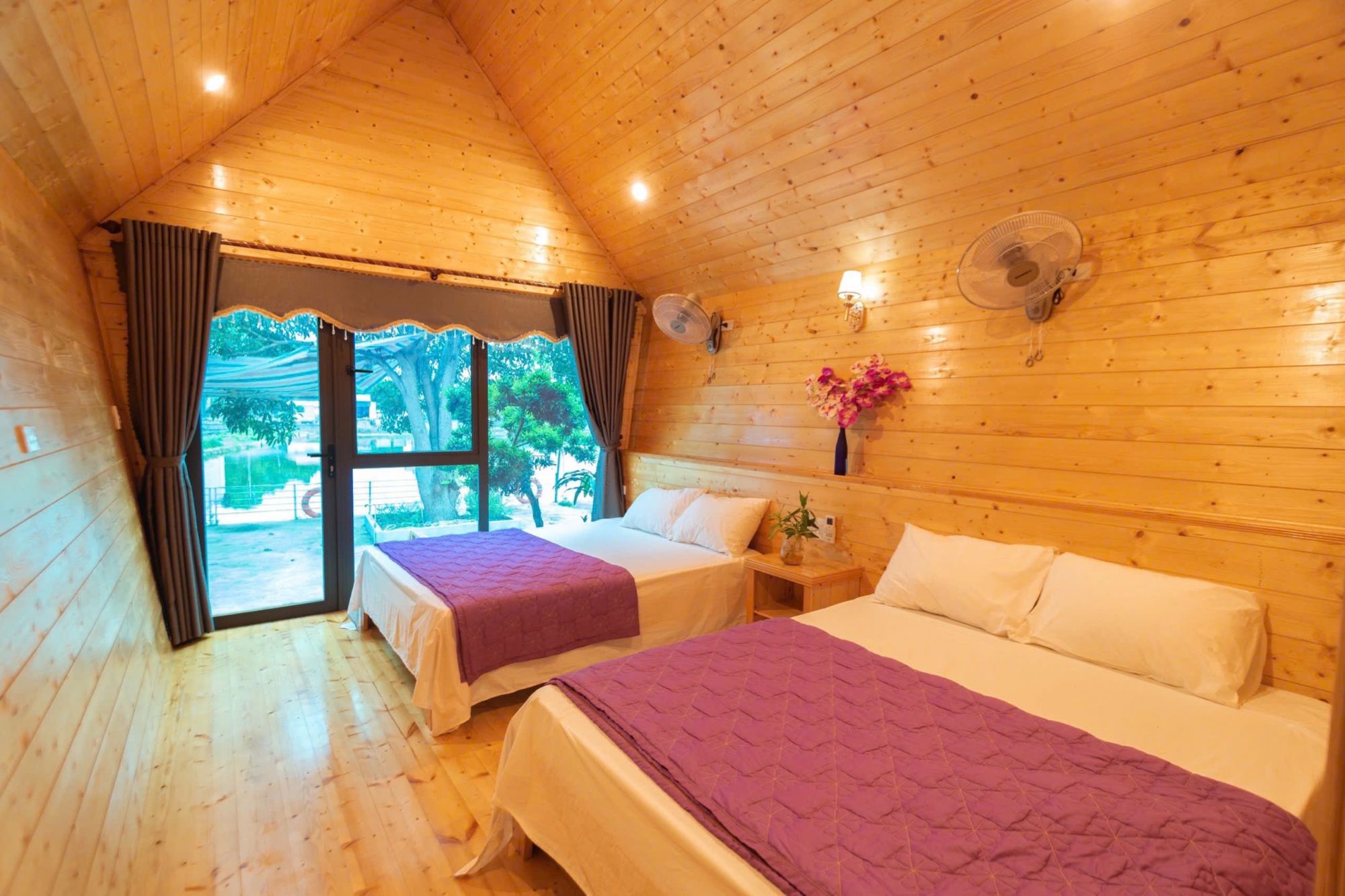Bên trong mỗi căn bungalow là không gian gọn gàng nhưng tinh tế, sử dụng hoàn toàn chất liệu gỗ mang lại cảm giác ấm áp và dễ chịu. Phòng được bố trí giường êm ái, chăn ga sạch sẽ, điều hòa, quạt, nước nóng và phòng tắm khép kín, đáp ứng đầy đủ nhu cầu nghỉ ngơi của du khách.