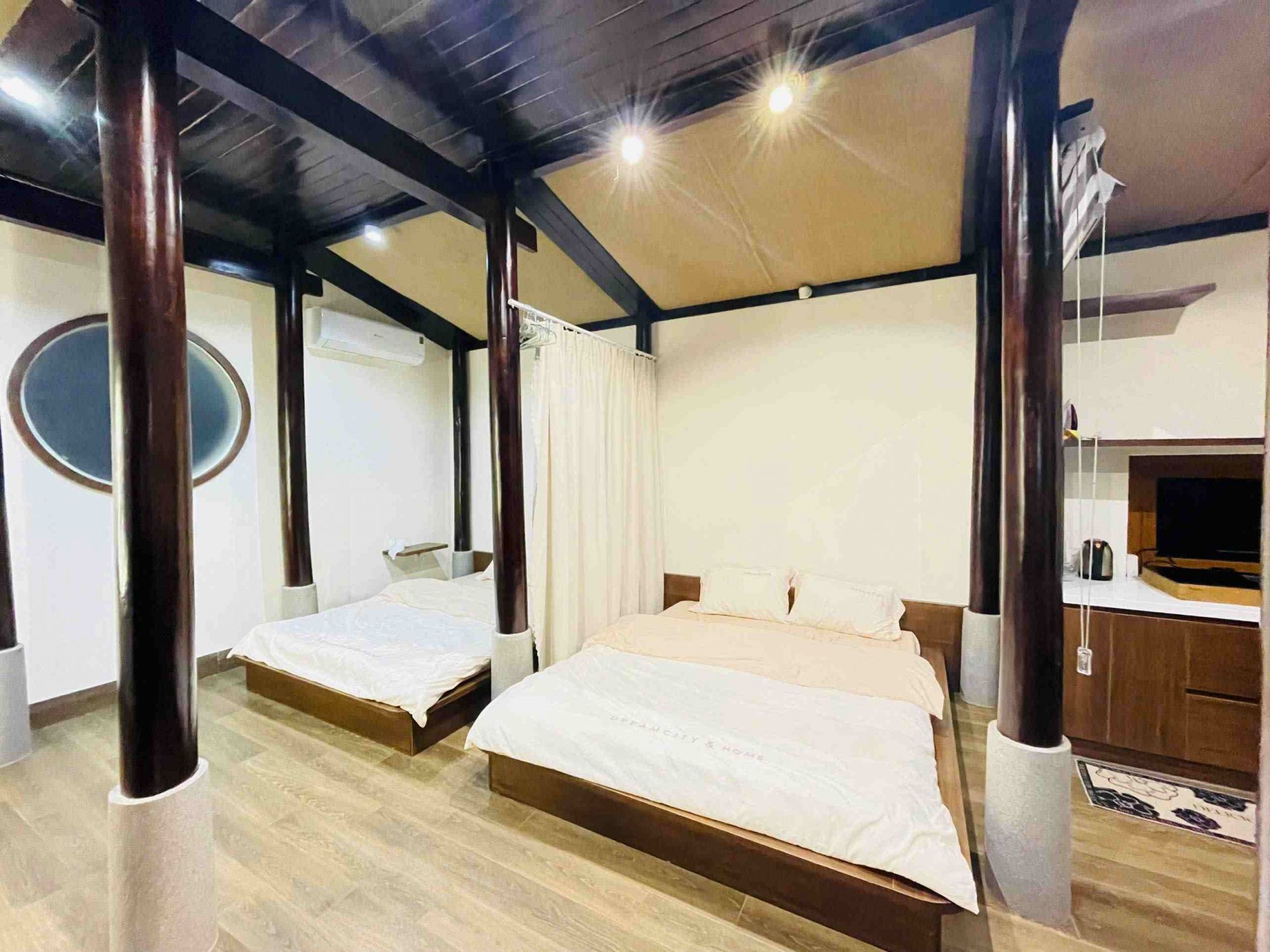 Mây 2 được thiết kế với tiêu chuẩn 2 giường đôi, phù hợp cho 4 người lớn sử dụng thoải mái. Với nhóm đông hơn, homestay linh hoạt bố trí thêm 1 nệm cho 6–7 người hoặc 2 nệm cho nhóm 8 người, giúp tất cả thành viên đều có không gian nghỉ ngơi riêng. Không gian phòng rộng rãi, sáng sủa, nội thất tối giản nhưng tiện dụng, đáp ứng tốt cả nhu cầu nghỉ dưỡng lẫn sinh hoạt nhóm.
