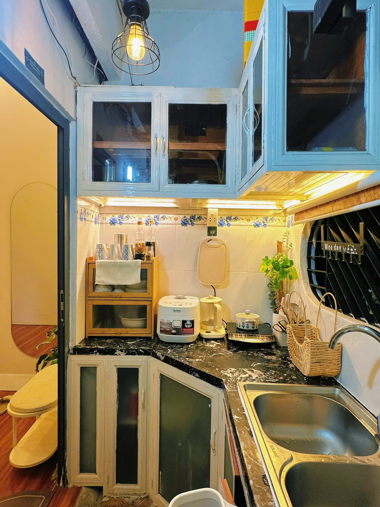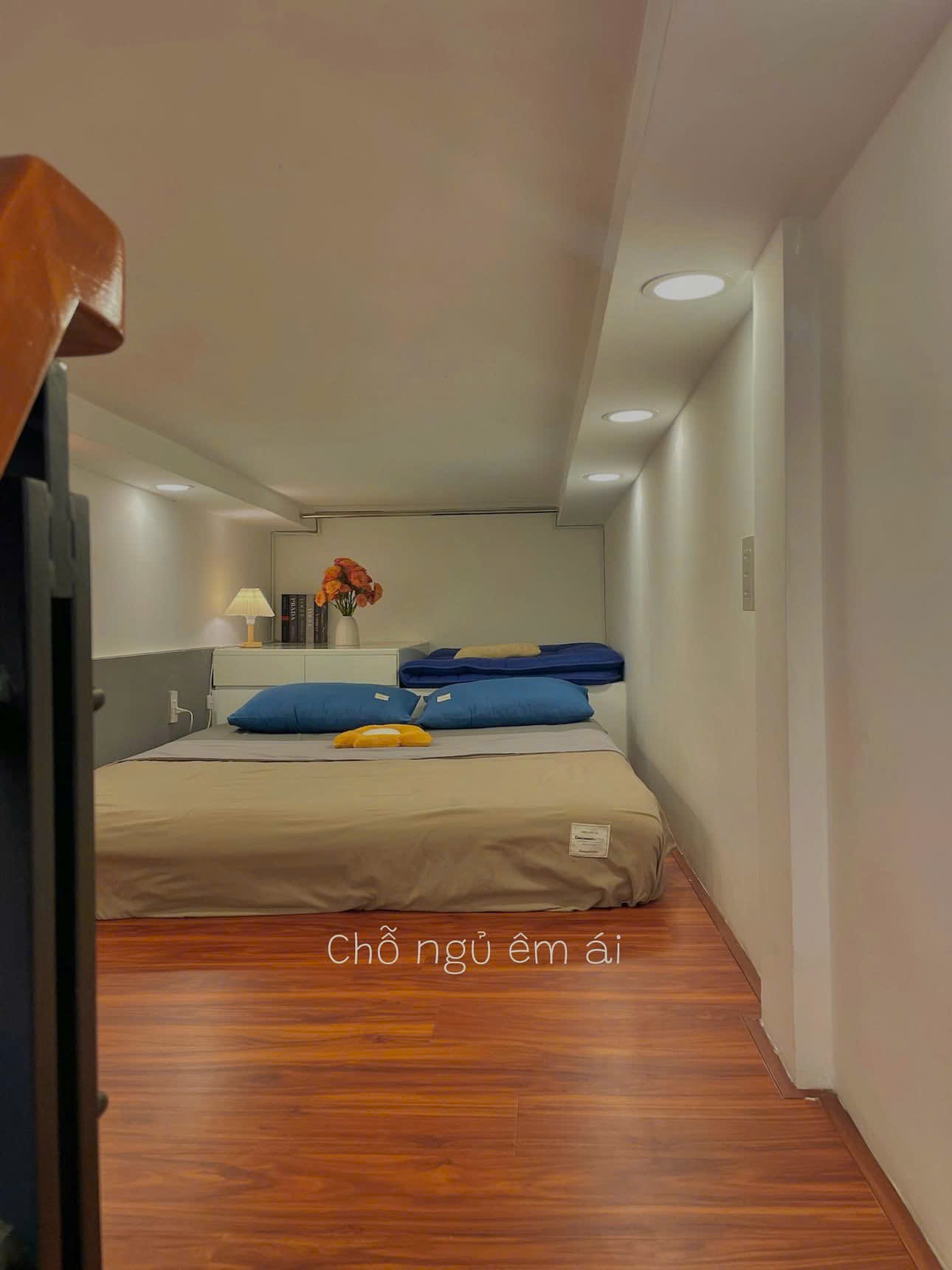 Homestay sở hữu thiết kế dạng gác lửng, vừa gần gũi vừa tiện nghi, mang lại cảm giác thoải mái và riêng tư cho những ai muốn tận hưởng một không gian bé xinh giữa trung tâm thành phố. Từ ban công phía trước, bạn có thể phóng tầm mắt ra những biểu tượng nổi tiếng của Sài Gòn như Bitexco, Vincom Đồng Khởi, hay đơn giản là nhìn xuống công viên xanh mát phía dưới. Không khí luôn thoáng đãng, mát mẻ – rất phù hợp để thư giãn, đọc sách hay nhâm nhi một ly cà phê buổi sáng.