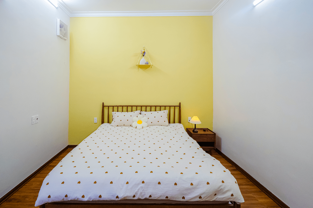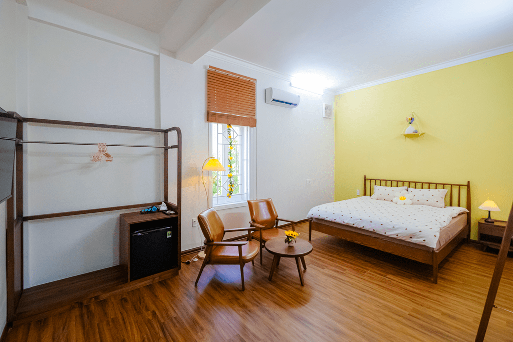 Phòng ngủ nhà Mô Tê Homestay 2 được thiết kế theo kiểu tươi sáng, giường 1m8 giúp khách đến Huế có một nơi nghỉ ngơi thoải mái và ấm áp nhất, có nhiều góc chill chill, “tách tách tách” là có ngay ảnh đẹp cho khách