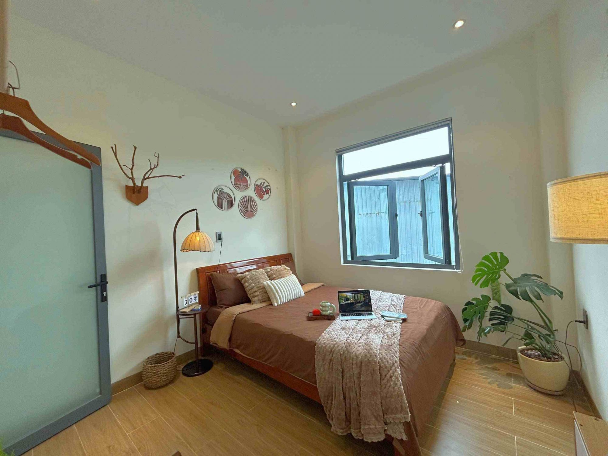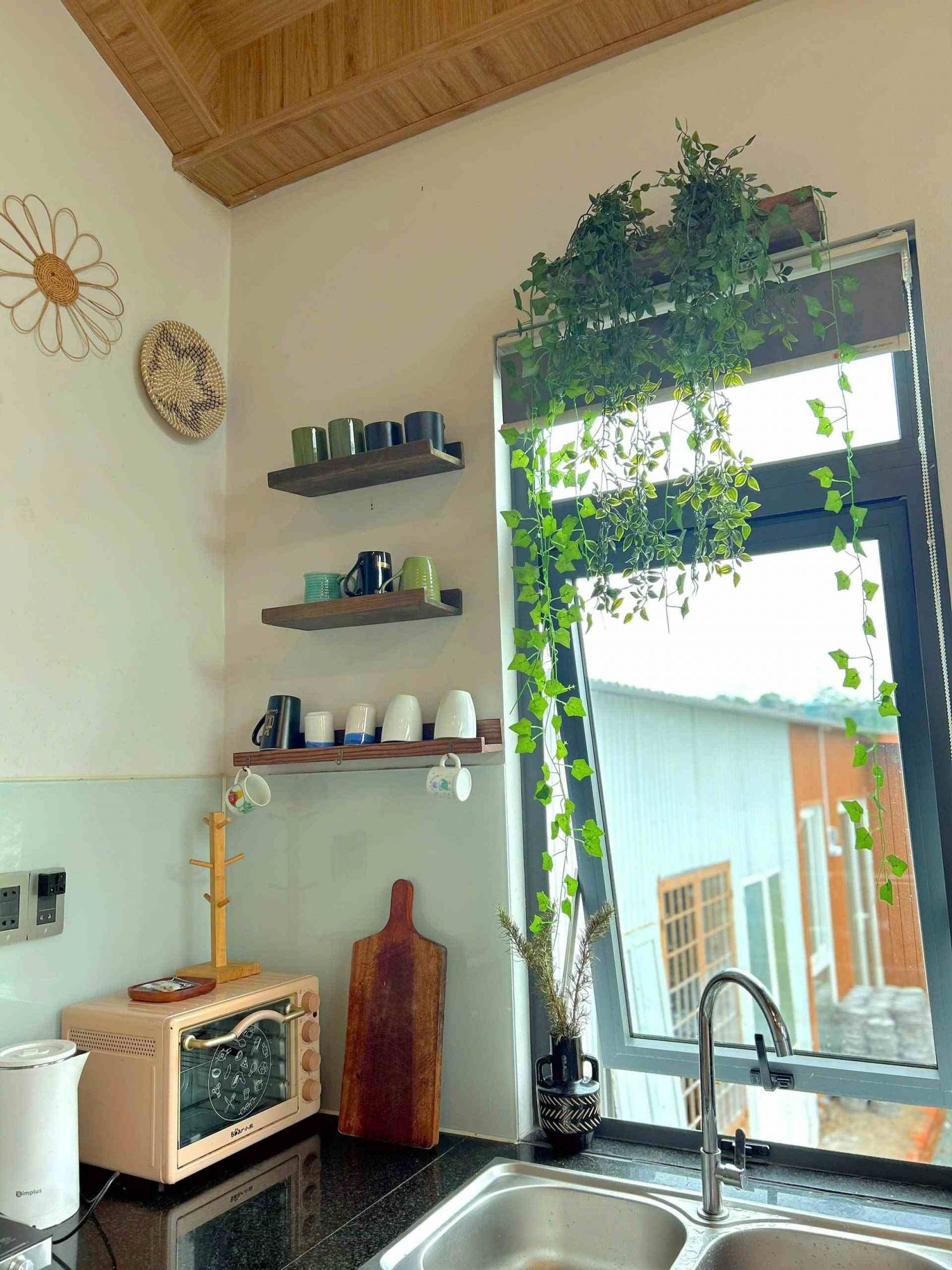 Homestay được bố trí hợp lý với 1 phòng đơn và 1 phòng đôi, phù hợp nhóm 4-6 người. Mỗi phòng đều được chăm chút tỉ mỉ, đón nắng và gió tự nhiên tạo nên không gian nghỉ ngơi thoáng đãng. Ngoài ra, nhà còn có 1 phòng khách, 1 phòng bếp đầy đủ tiện nghi và 1 nhà vệ sinh sạch sẽ. Không gian bếp được trang bị sẵn dụng cụ nấu ăn, giúp du khách có thể tự tay chuẩn bị bữa cơm ấm cúng hoặc tổ chức tiệc BBQ ngay tại sân nhà.