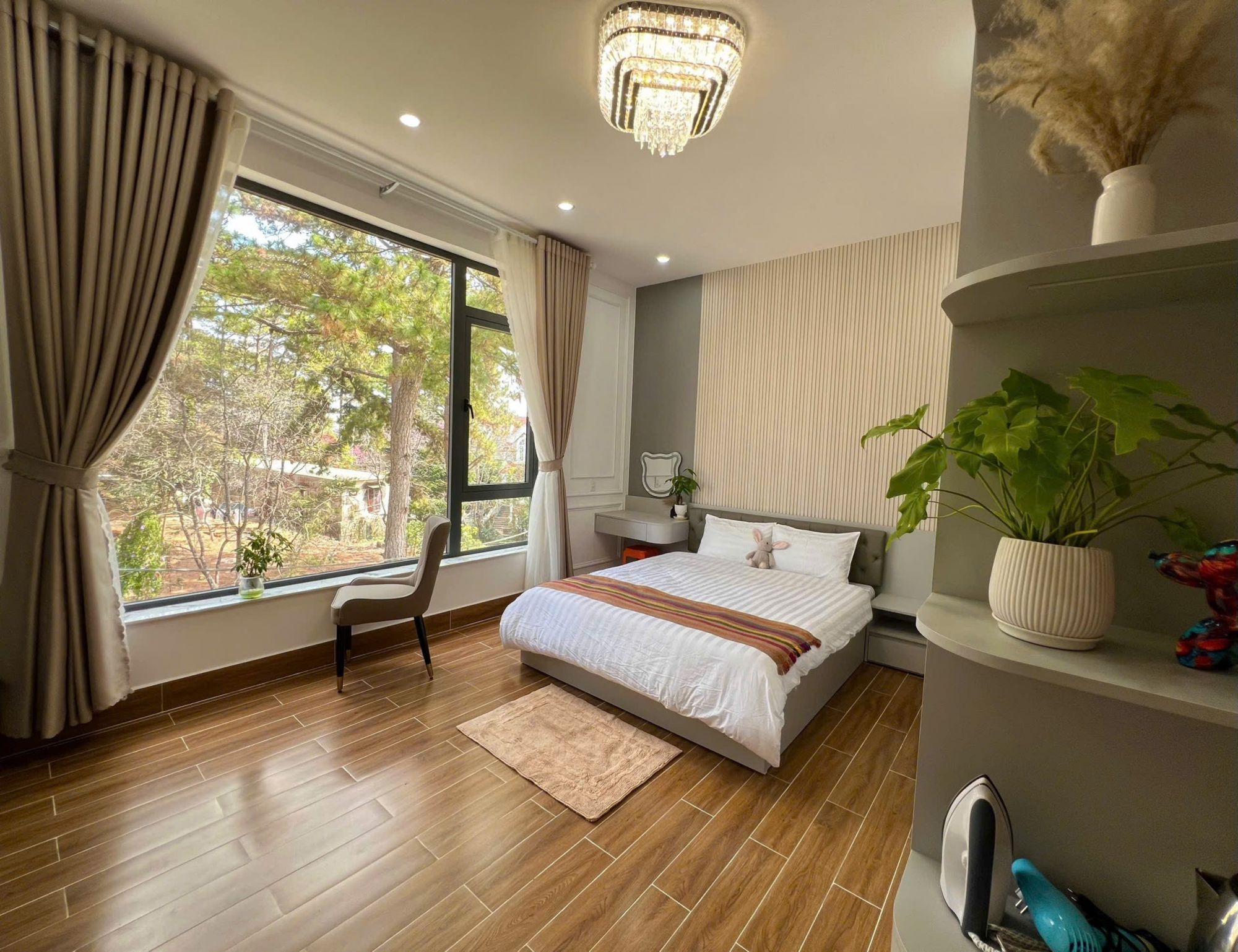 Với 5 phòng ngủ, căn nhà có thể đón từ 10 đến 18 khách, đáp ứng tốt nhu cầu của gia đình nhiều thế hệ hoặc nhóm bạn đông thành viên. Mỗi phòng đều được chăm chút về màu sắc và cách bài trí, ưu tiên sự thoáng đãng và tiện nghi. Giường ngủ êm ái, không gian lưu trữ hợp lý và cửa sổ đón gió giúp mỗi buổi sáng trở nên nhẹ nhàng hơn.
