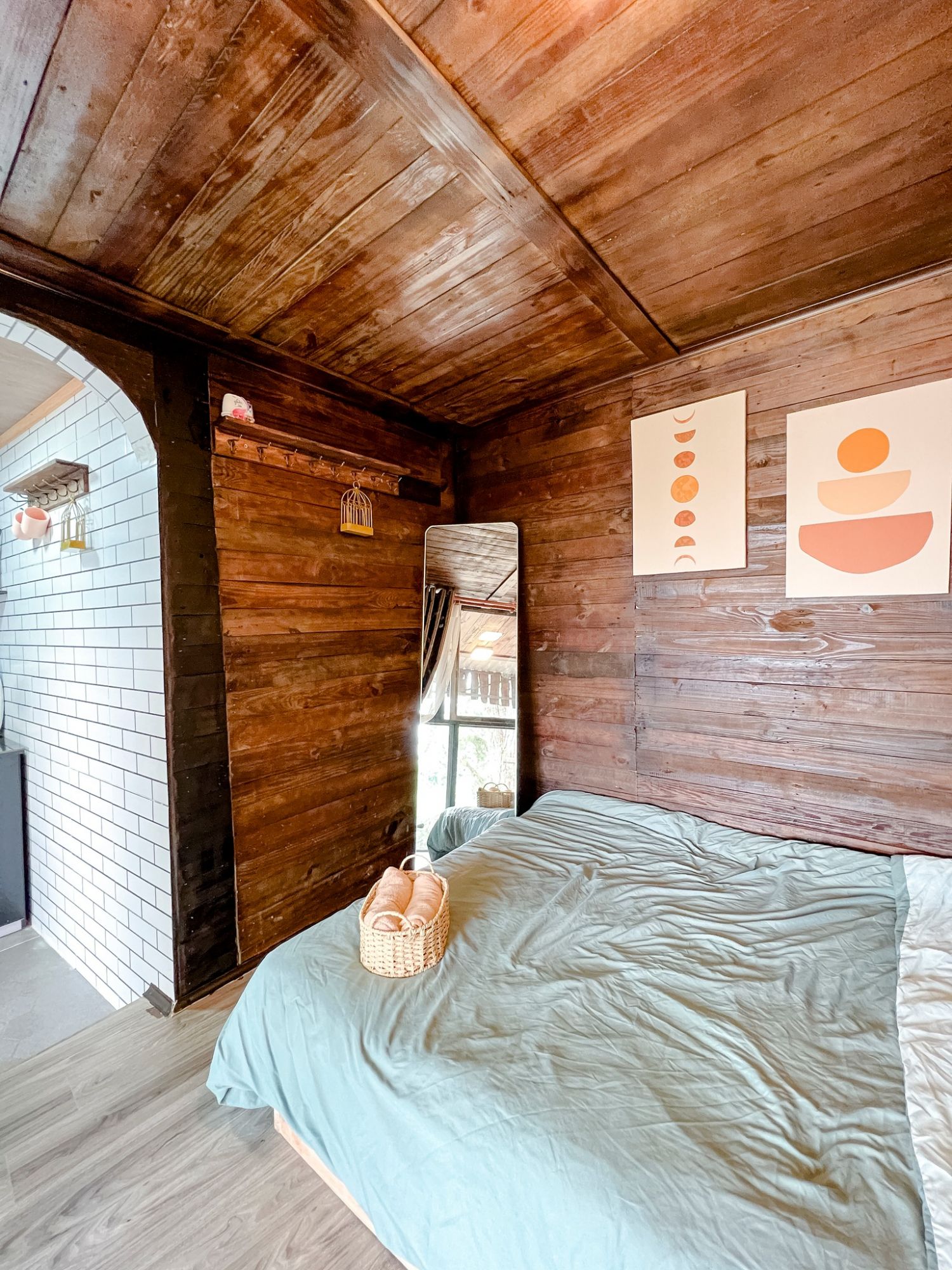 Căn phòng được thiết kế theo phong cách tối giản nhưng tinh tế, với gam màu ấm áp và nội thất gỗ tạo cảm giác gần gũi. Ánh sáng tự nhiên len qua khung cửa giúp không gian luôn mềm mại vào ban ngày, còn buổi tối lại trở nên ấm cúng dưới ánh đèn dịu nhẹ.