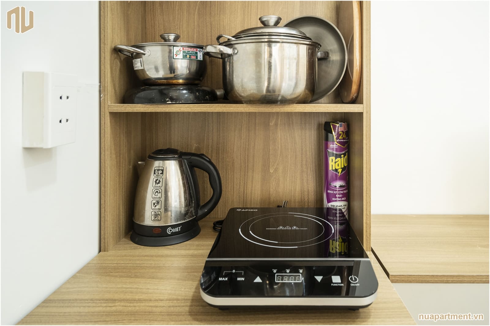Bếp nhỏ gọn, đầy đủ dụng cụ nấu ăn, tủ lạnh, bếp điện – phù hợp với những bữa ăn tự tay chuẩn bị.