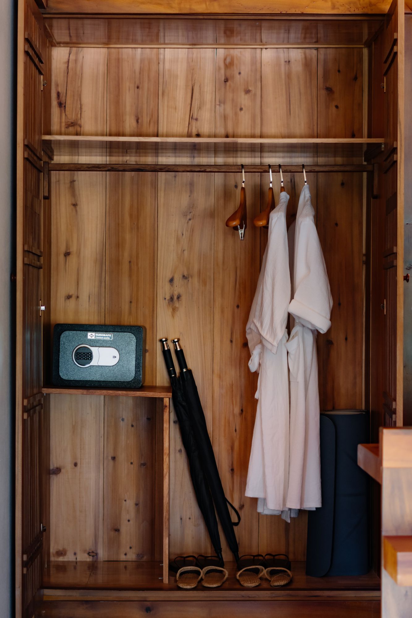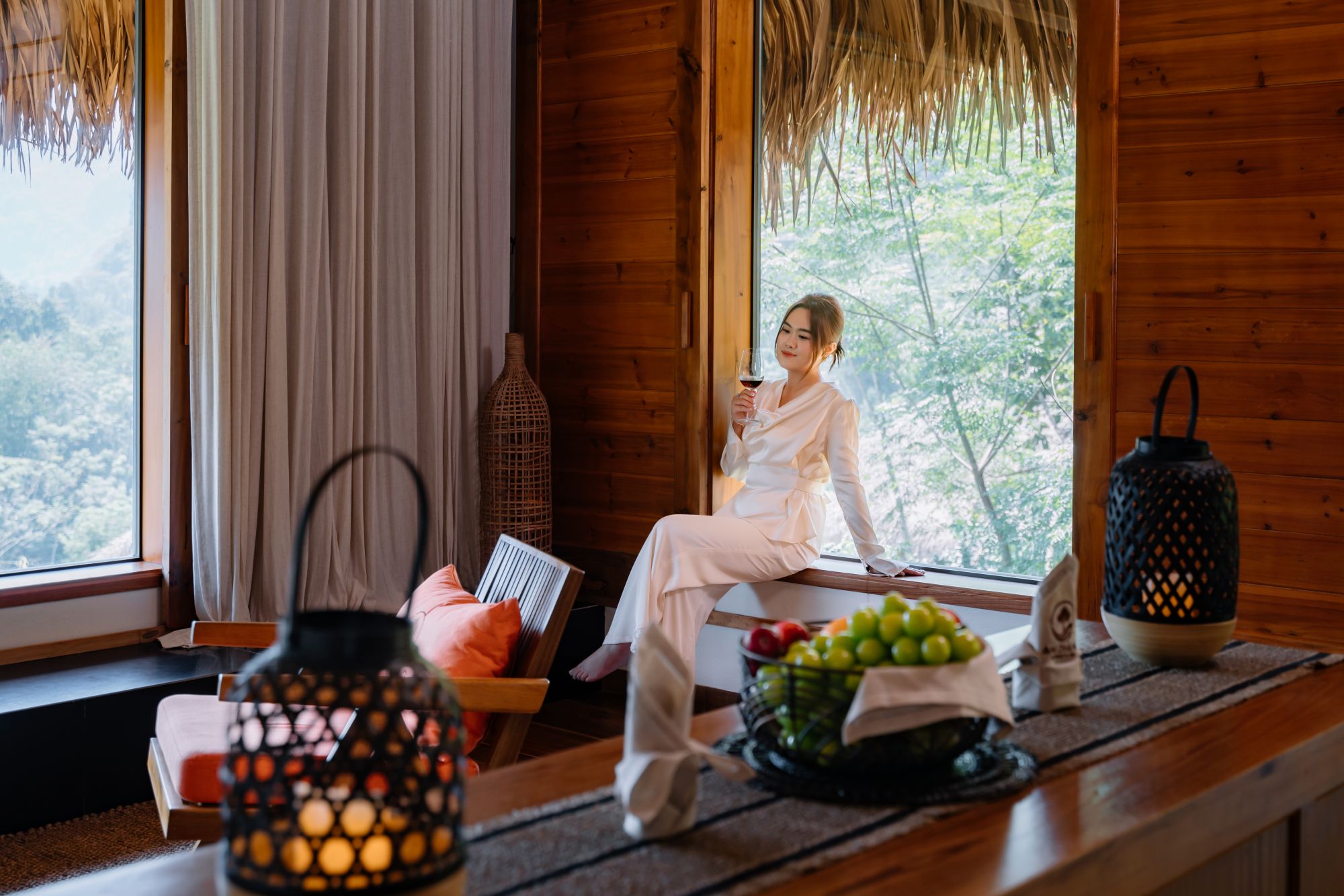 Điểm nhấn đặc biệt không thể bỏ qua chính là ban công 10m² với bộ ghế thư giãn dành cho hai người. Từ đây, tầm nhìn mở ra khung cảnh những mái cọ thấp thoáng trong màu xanh núi rừng, gợi nên cảm giác bình yên khó tìm ở những điểm nghỉ dưỡng đông đúc. Ánh sáng buổi sớm, sương nhẹ đầu ngày hay sắc hoàng hôn đổ xuống thung đều trở nên đẹp lạ qua góc nhìn này.