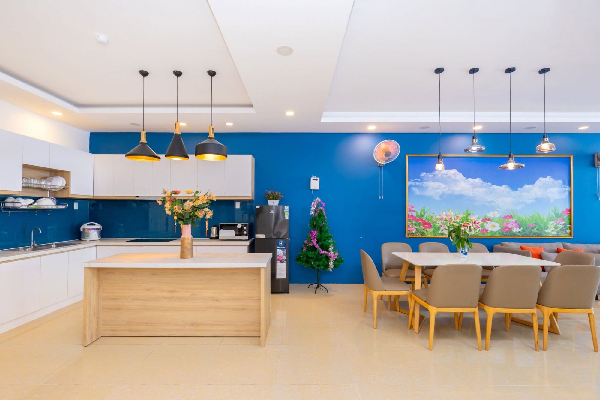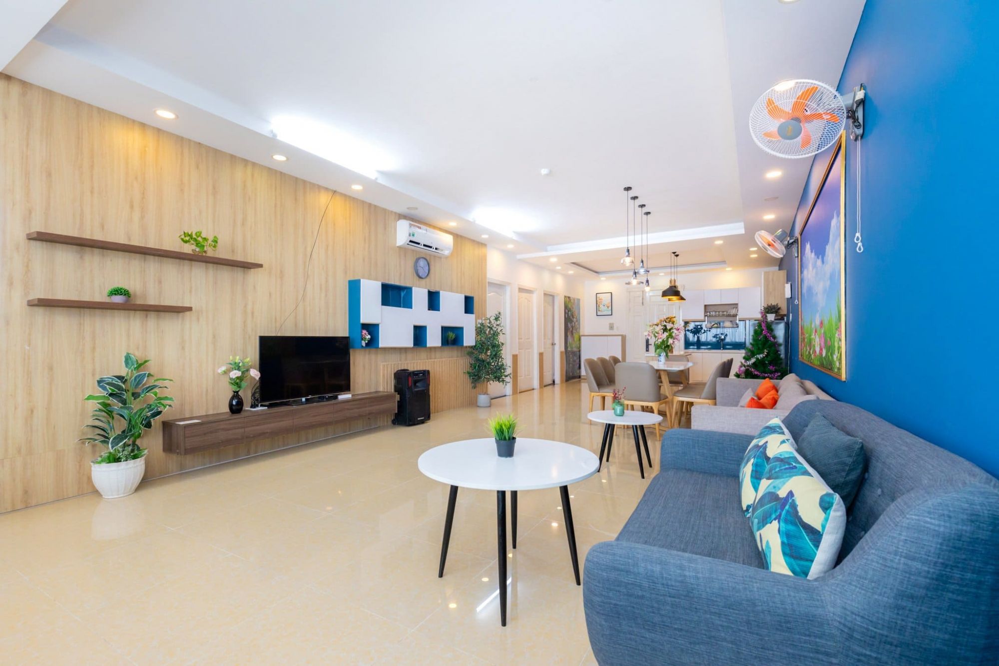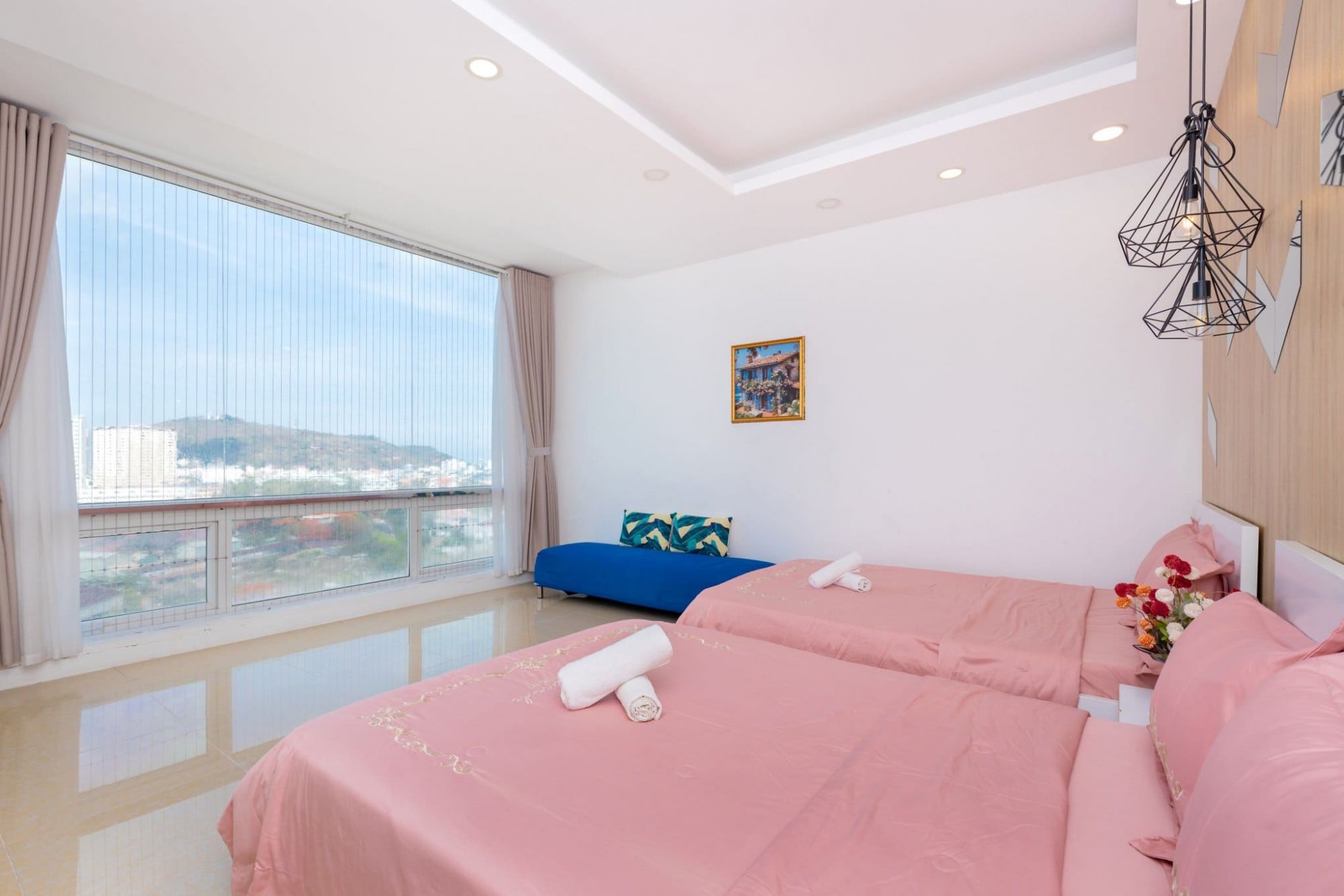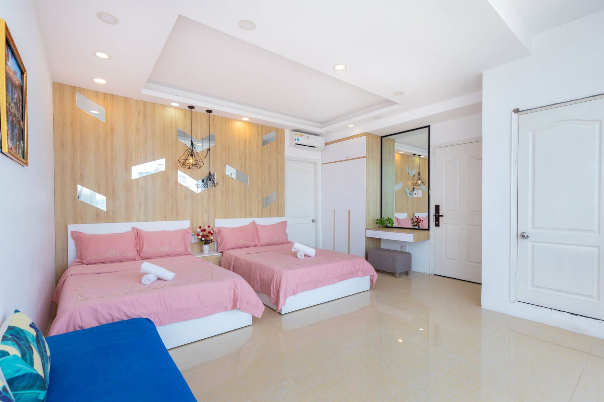 Không gian căn hộ được thiết kế thông thoáng, ấm cúng và phù hợp với các gia đình hoặc nhóm bạn bè. Các phòng ngủ có thể kê thêm nệm linh hoạt để phục vụ nhóm đông người.