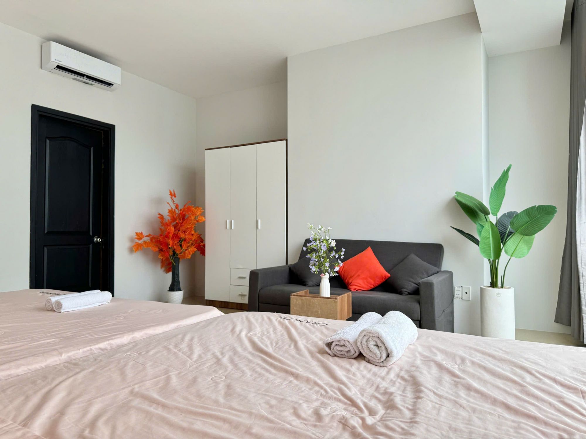Không gian bên trong căn hộ được thiết kế thoáng đãng, phù hợp cho các gia đình hoặc nhóm bạn bè đi nghỉ dưỡng, tổ chức họp mặt, sinh hoạt chung. Các phòng ngủ có thể linh hoạt kê thêm nệm nếu cần thêm chỗ nghỉ.