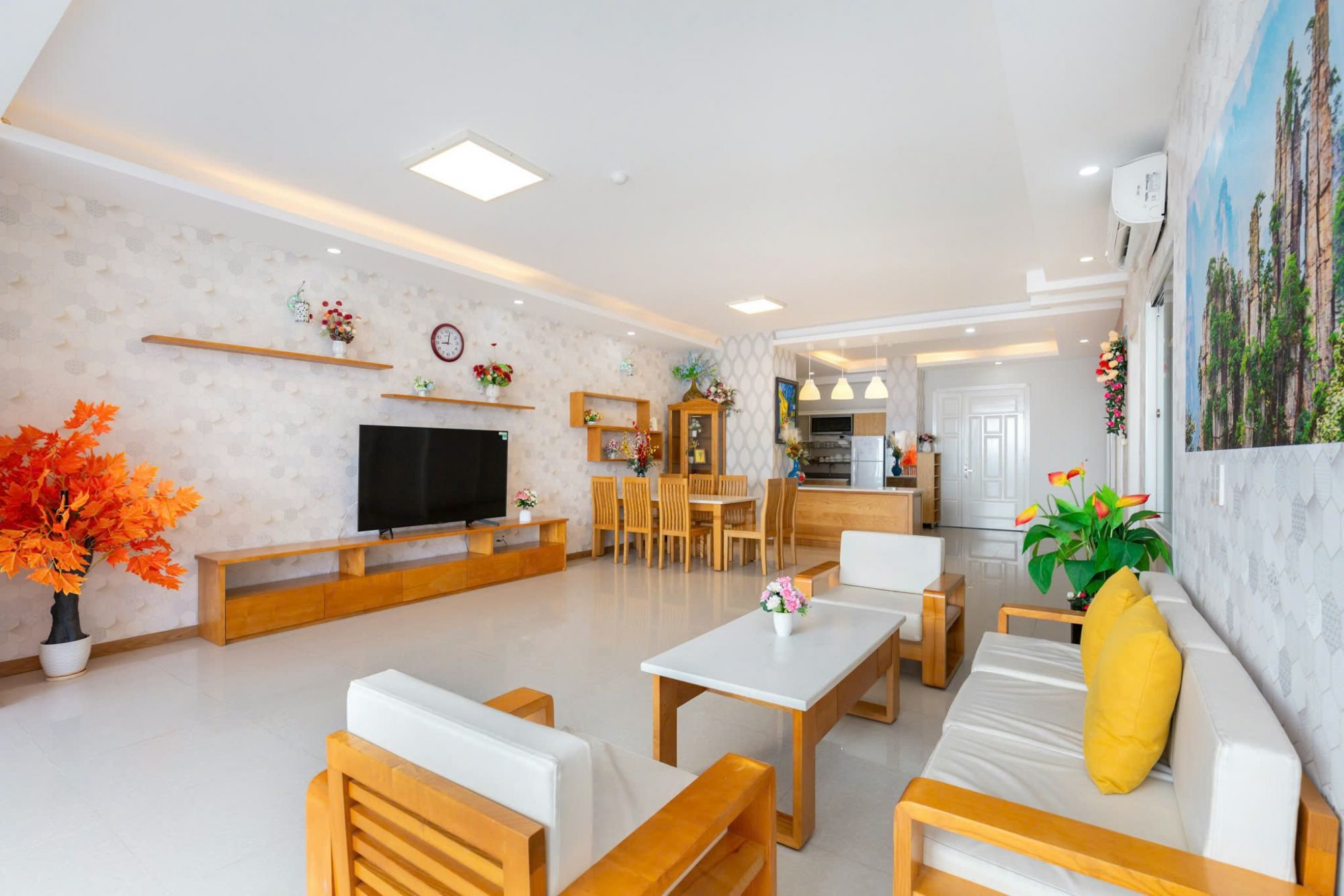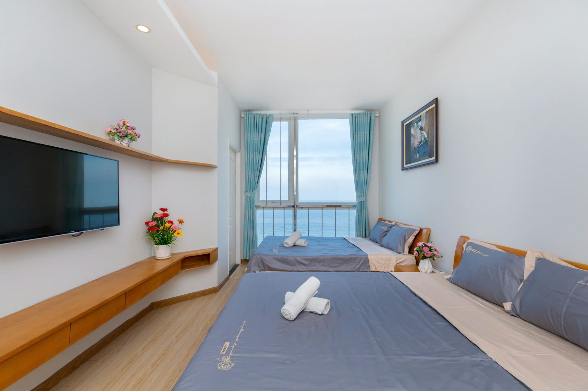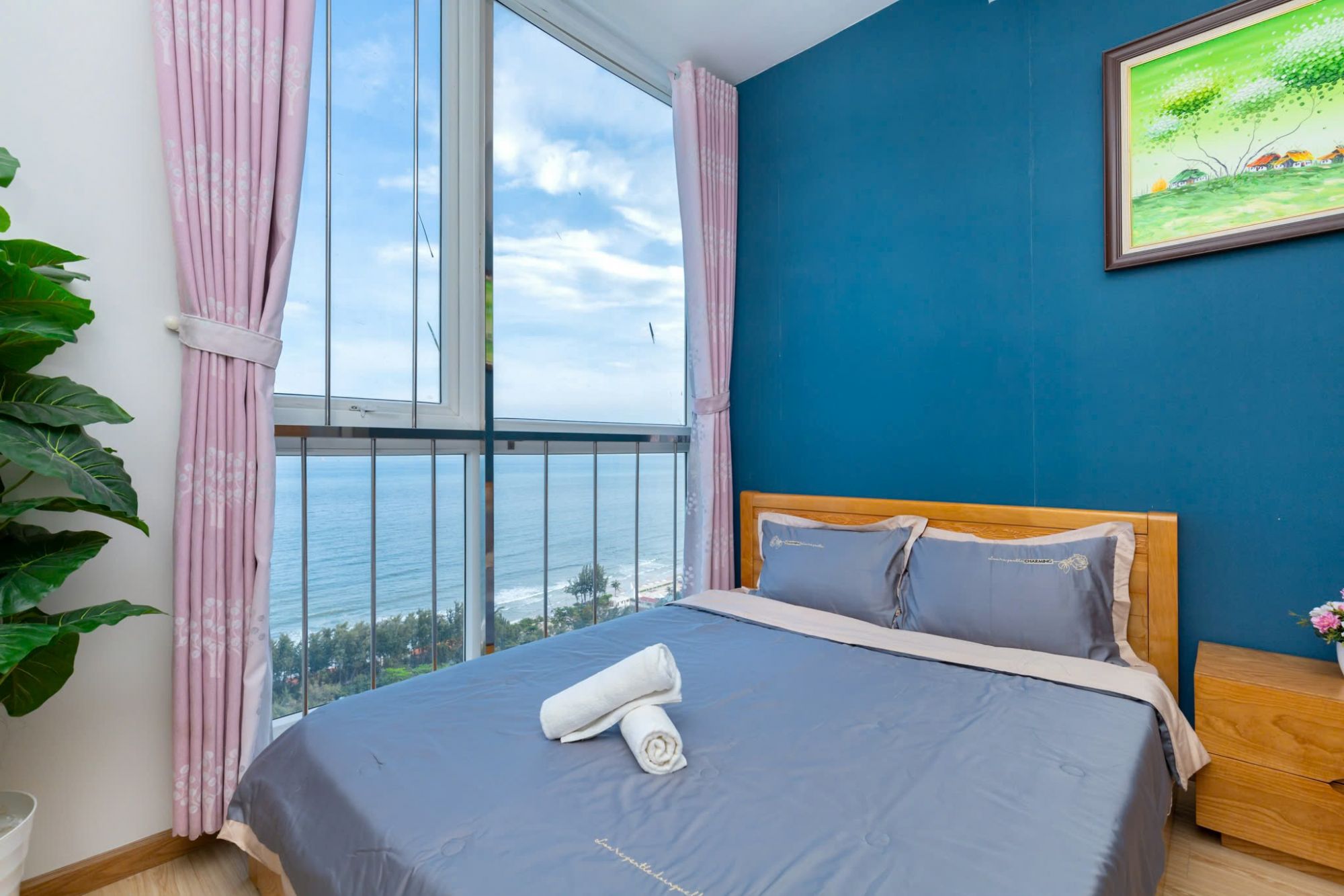 Không gian căn hộ rộng rãi, thoáng mát, được trang bị đầy đủ tiện nghi. Phòng ngủ và phòng khách có cửa kính lớn đón ánh sáng tự nhiên, mang đến cảm giác dễ chịu và thư giãn.