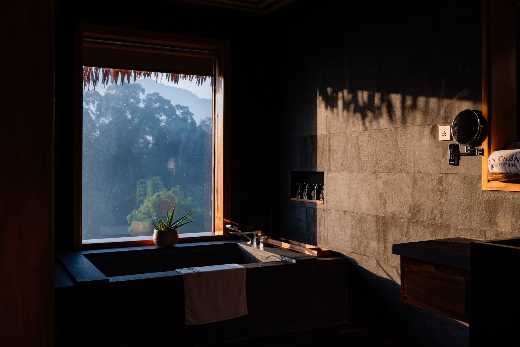 Phòng tắm của Peach Blossom Lakeview cũng là một điểm nhấn quan trọng với bồn tắm đá tự nhiên và không gian vệ sinh tách biệt. Thiết kế hướng đến sự thư giãn sâu, nơi dòng nước ấm và hương thảo dược có thể giúp hồi phục cơ thể sau ngày dài khám phá Hà Giang.