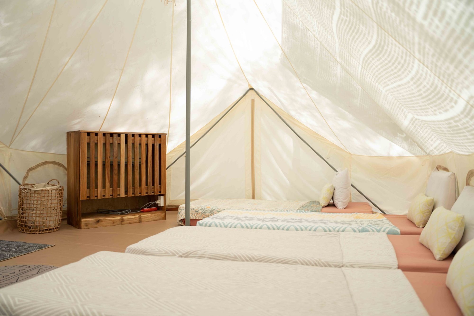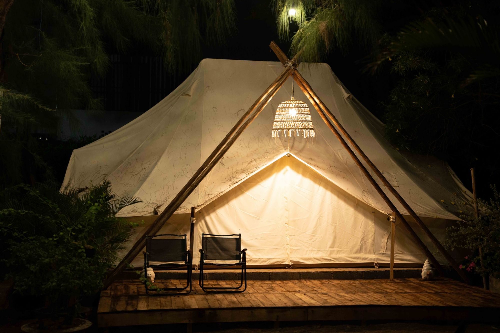 Tại Pi Glamping, mỗi căn lều được thiết kế tinh tế với đầy đủ tiện nghi, từ giường ngủ êm ái, máy lạnh cho đến khu vệ sinh riêng biệt. Không chỉ là chỗ nghỉ, những căn lều glamping ở đây còn là “góc chill” cực đẹp để ngắm hoàng hôn, đọc sách hay thưởng thức ly cà phê giữa không gian thoáng đãng. Với tông màu ấm áp và ánh đèn vàng lung linh mỗi tối, nơi này mang đến cảm giác vừa sang trọng vừa gần gũi với thiên nhiên.