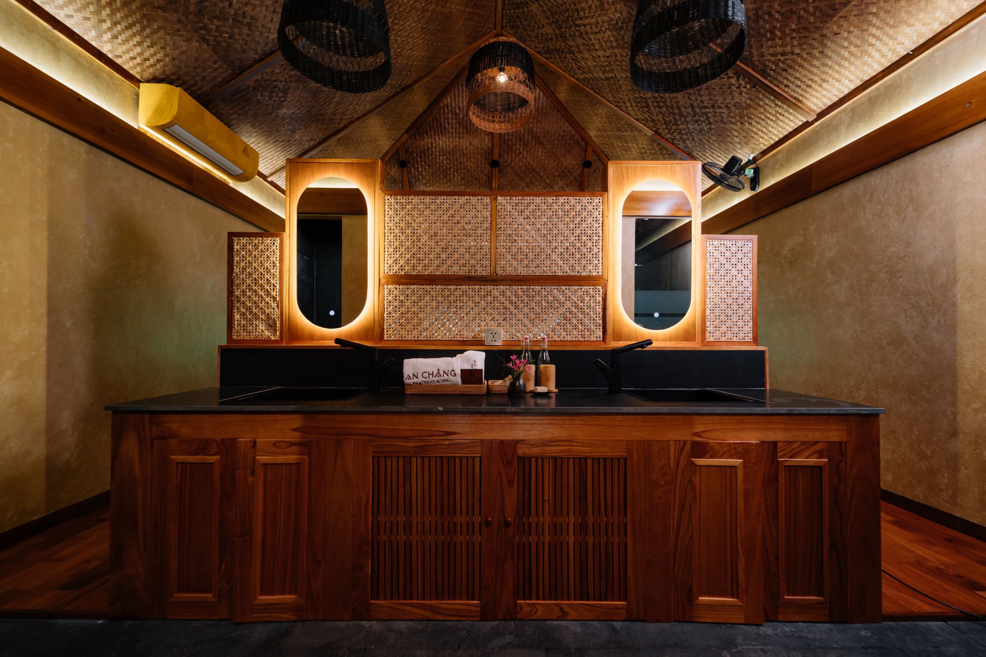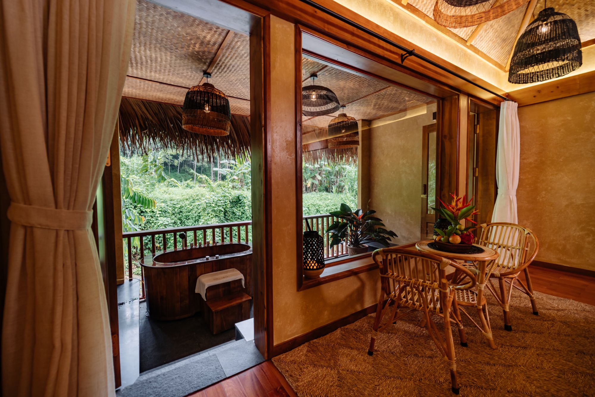 Khu vực phòng tắm được thiết kế hướng đến sự thoải mái tối đa. Bồn ngâm gỗ tự nhiên tạo nên trải nghiệm thư giãn sâu, giúp giải tỏa áp lực sau một ngày dài khám phá. Sự kết hợp giữa chất liệu tự nhiên và ánh sáng dịu mang lại cảm giác ấm cúng, trong khi khu vệ sinh riêng đảm bảo sự tiện nghi và riêng tư.