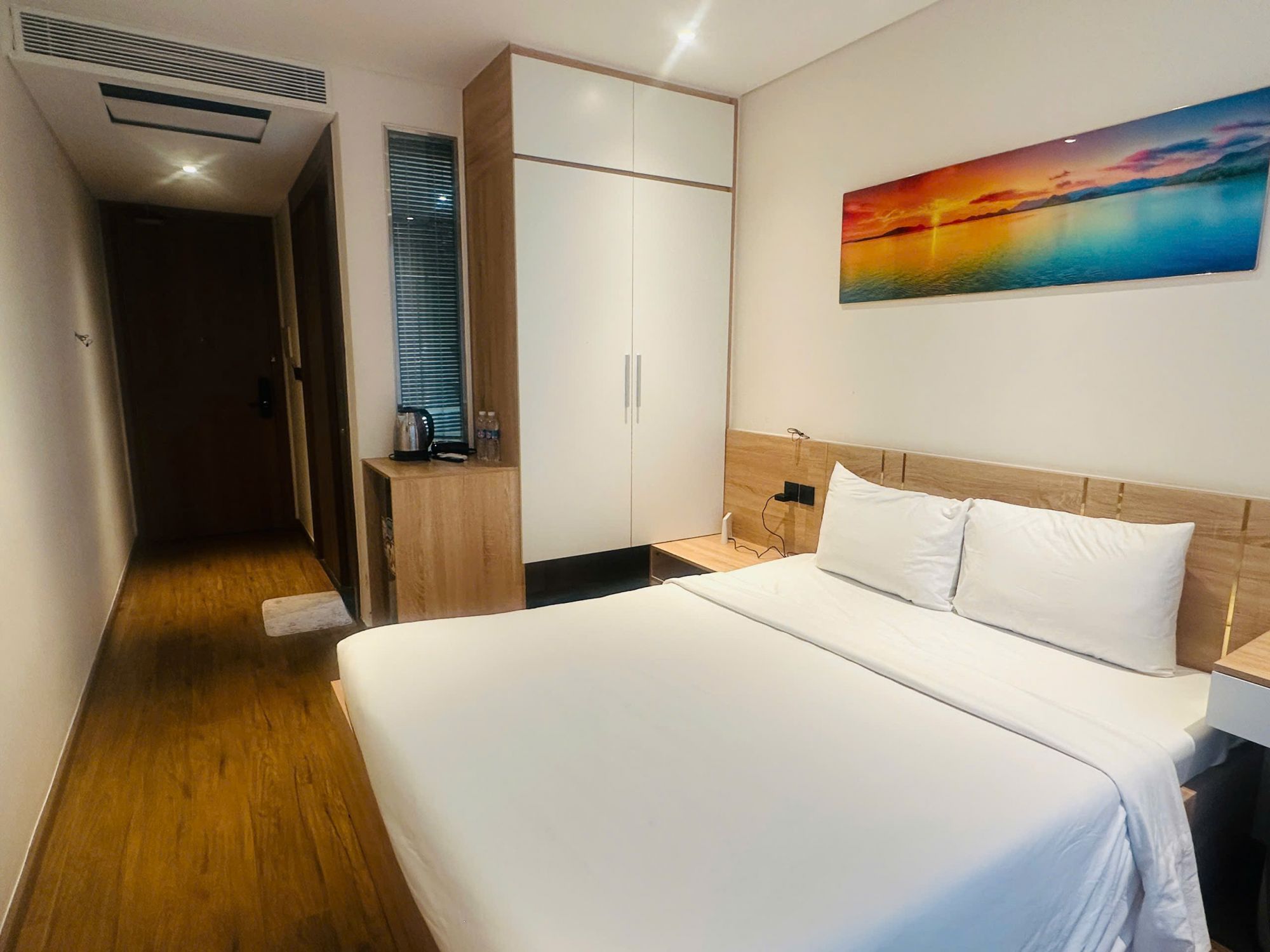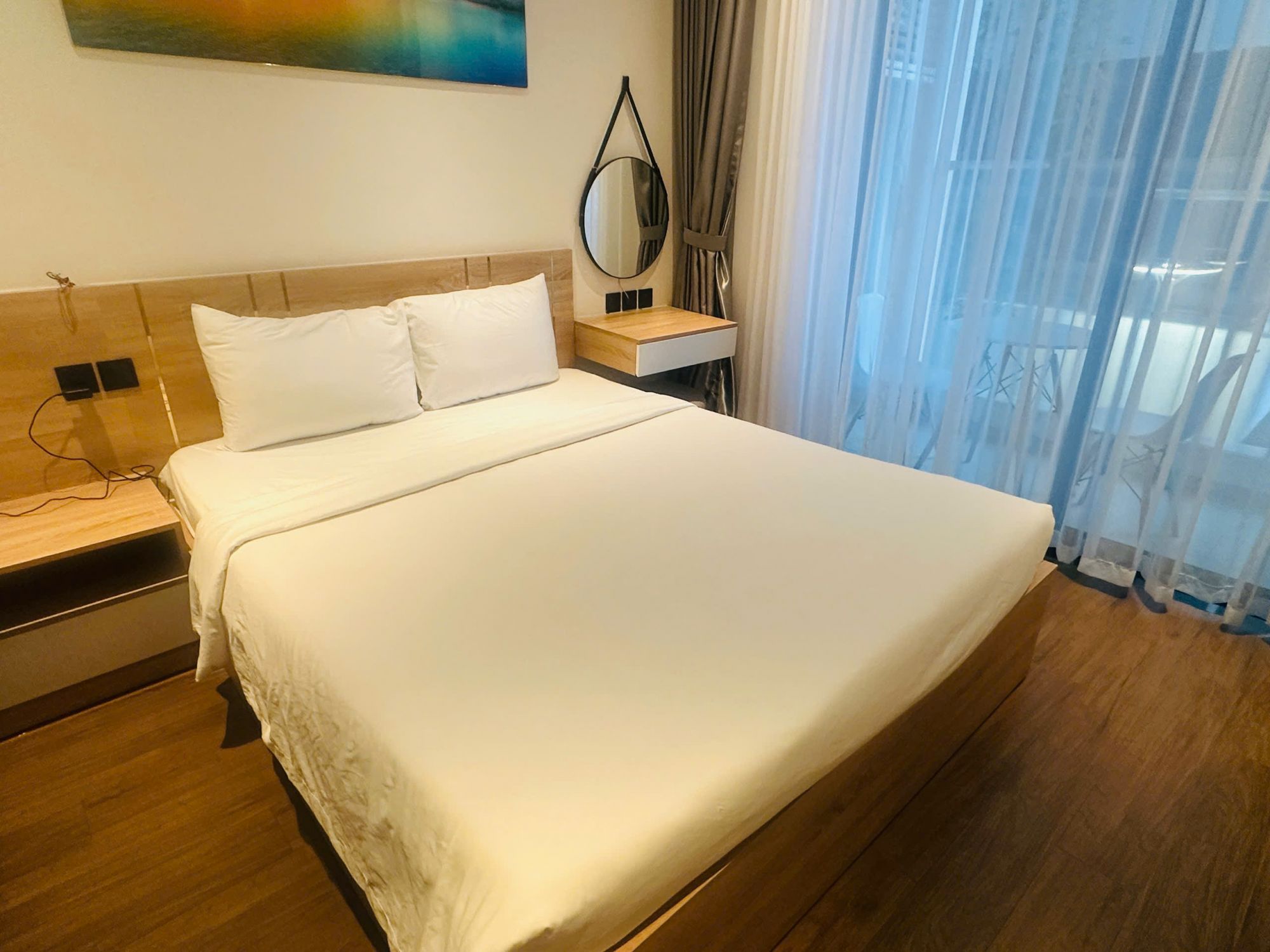 Tại đây, mỗi căn hộ đều có ban công riêng rộng rãi, cho phép du khách thu trọn vào tầm mắt cả thành phố lẫn đường chân trời xanh thẳm. Việc nhâm nhi ly cà phê buổi sớm hay thư giãn chiều muộn trên ban công đầy gió cũng trở thành một phần không thể thiếu trong trải nghiệm. Đặc biệt, hồ bơi vô cực nằm trên tầng cao nhất của khu căn hộ chính là điểm nhấn không thể bỏ qua – nơi lý tưởng để ngắm hoàng hôn rực rỡ trong một khung cảnh “chill” đúng nghĩa.