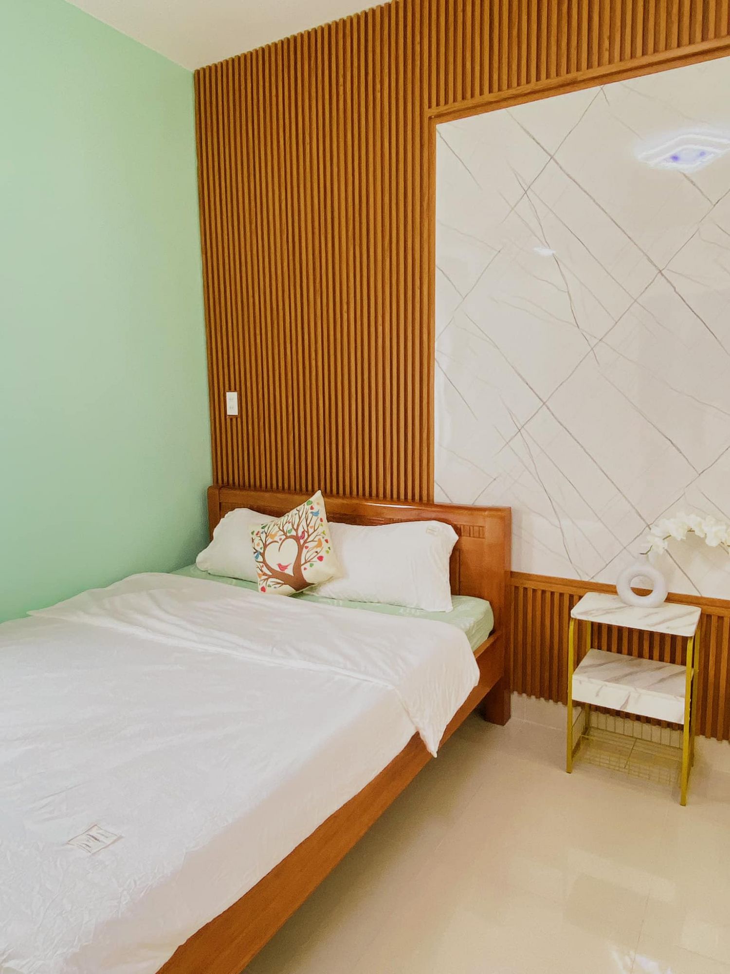 Một điểm dễ nhận thấy tại Pu homestay Huế là cách sử dụng màu sắc linh hoạt nhưng có kiểm soát. Mỗi phòng mang một sắc độ riêng, từ trung tính đến pastel nhẹ, tạo cảm giác mới mẻ mà không làm mất đi sự hài hòa tổng thể. Ánh sáng trần kết hợp với ánh sáng tự nhiên giúp không gian giữ được sự cân bằng, không quá gắt cũng không quá trầm.