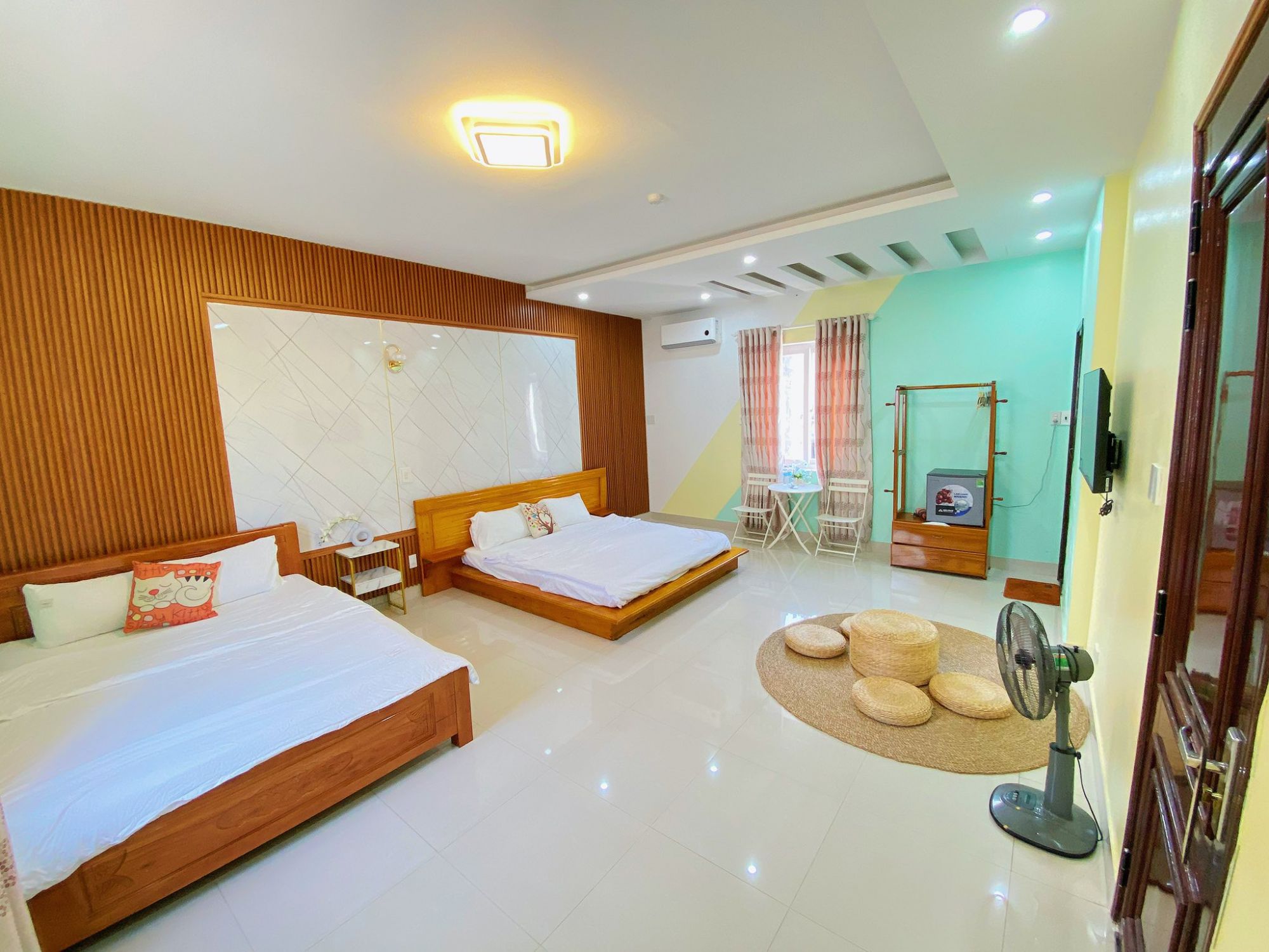 Phòng nghỉ tại Pu homestay Huế có diện tích tốt, trần cao và cách bố trí thoáng, tạo cảm giác dễ chịu ngay cả khi lưu trú dài ngày. Giường được đặt ở vị trí trung tâm, xung quanh là khoảng trống đủ rộng để di chuyển và sinh hoạt mà không bị gò bó. Ánh sáng trong phòng được phân bổ đều, giúp không gian luôn sáng sủa vào ban ngày và dịu lại khi đêm xuống.