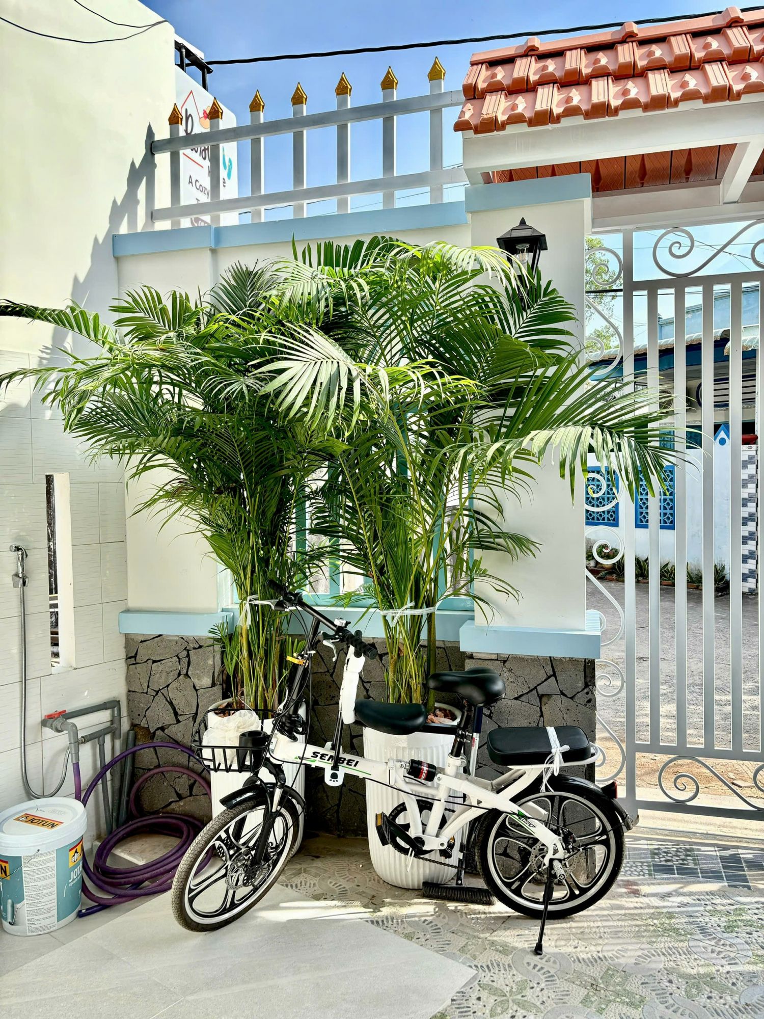 Một điểm cộng dễ thương tại Rosie Home là khoảng sân vườn nhỏ phía ngoài. Không gian này mang lại cảm giác mát mẻ, phù hợp để ngồi thư giãn, tổ chức những bữa BBQ đơn giản hoặc tận hưởng buổi chiều gió biển. Cây xanh được bố trí vừa đủ, tạo bóng mát và làm dịu không gian xung quanh.