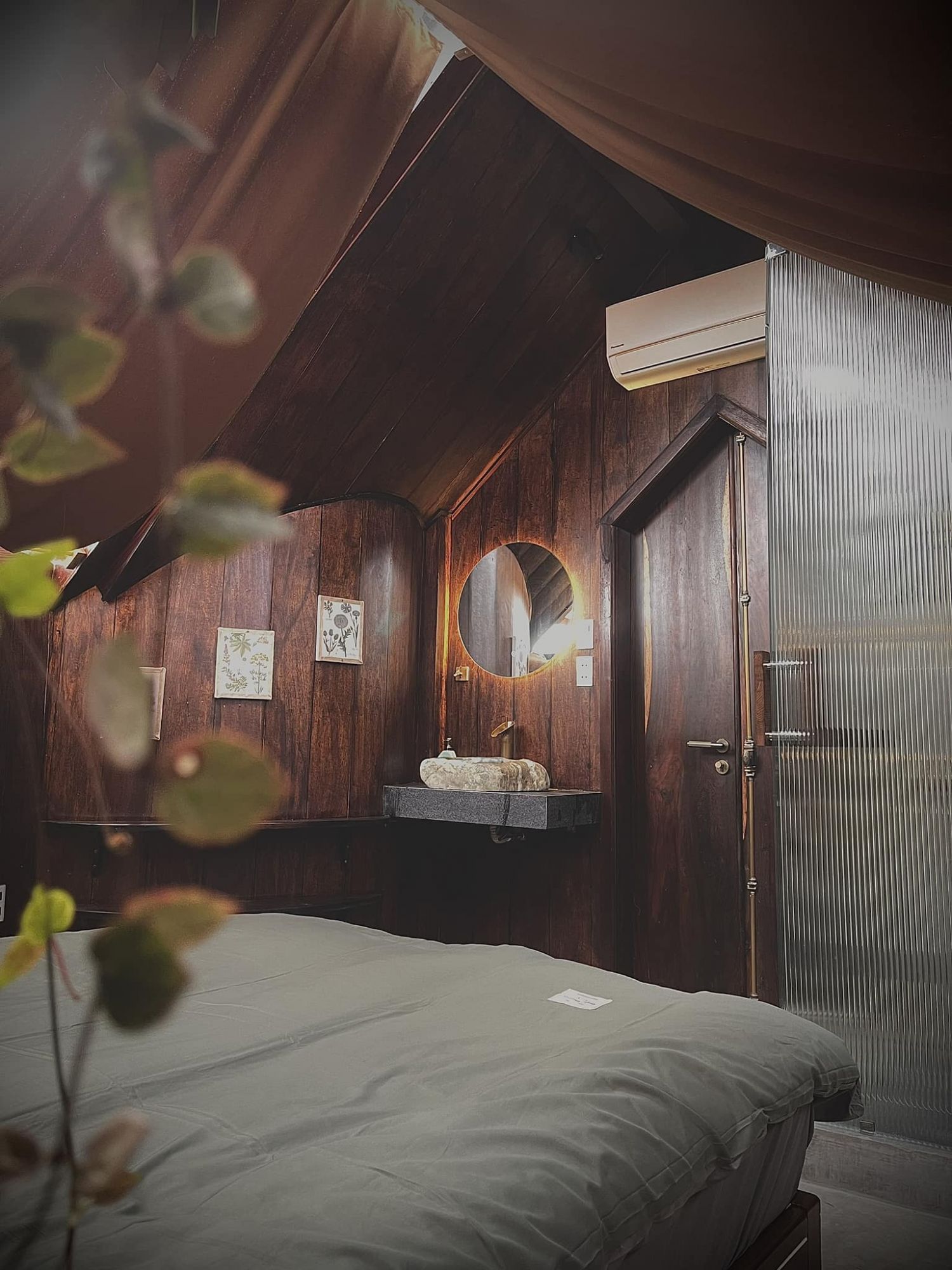 Skyfall – Mái Rêu Homestay mở ra một không gian nghỉ dưỡng mang màu sắc rất riêng giữa vùng Trại Mát se lạnh. Với cảm hứng từ sự giao thoa giữa thiên nhiên và sự ấm áp của gỗ, căn phòng được thiết kế theo tone xanh lá dịu mắt kết hợp vật liệu mộc mạc, tạo cảm giác thư giãn ngay từ khoảnh khắc đầu tiên đặt chân vào.