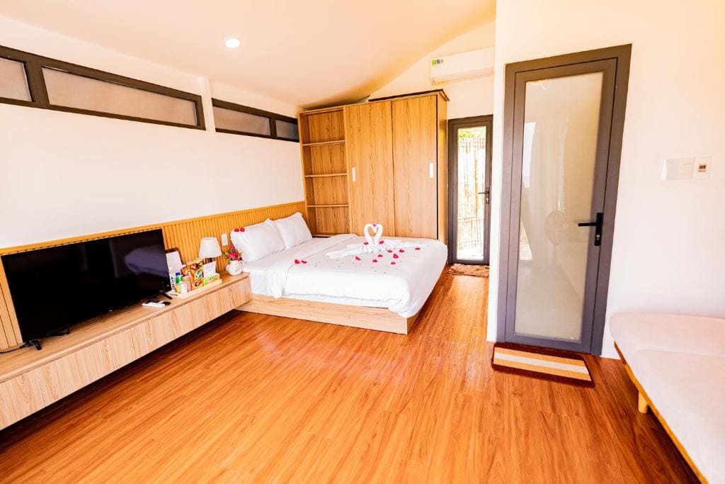 Một điểm đặc biệt tại đây là mỗi phòng đều có ban công hướng biển, mang lại tầm nhìn thư giãn và thoáng mát. Du khách có thể đón bình minh ngay từ phòng nghỉ hoặc ngắm hoàng hôn dần buông trên mặt biển. Các phòng được trang bị đầy đủ ga trải giường, khăn tắm, thiết kế tối giản nhưng tinh tế, tạo cảm giác ấm cúng và tiện nghi.