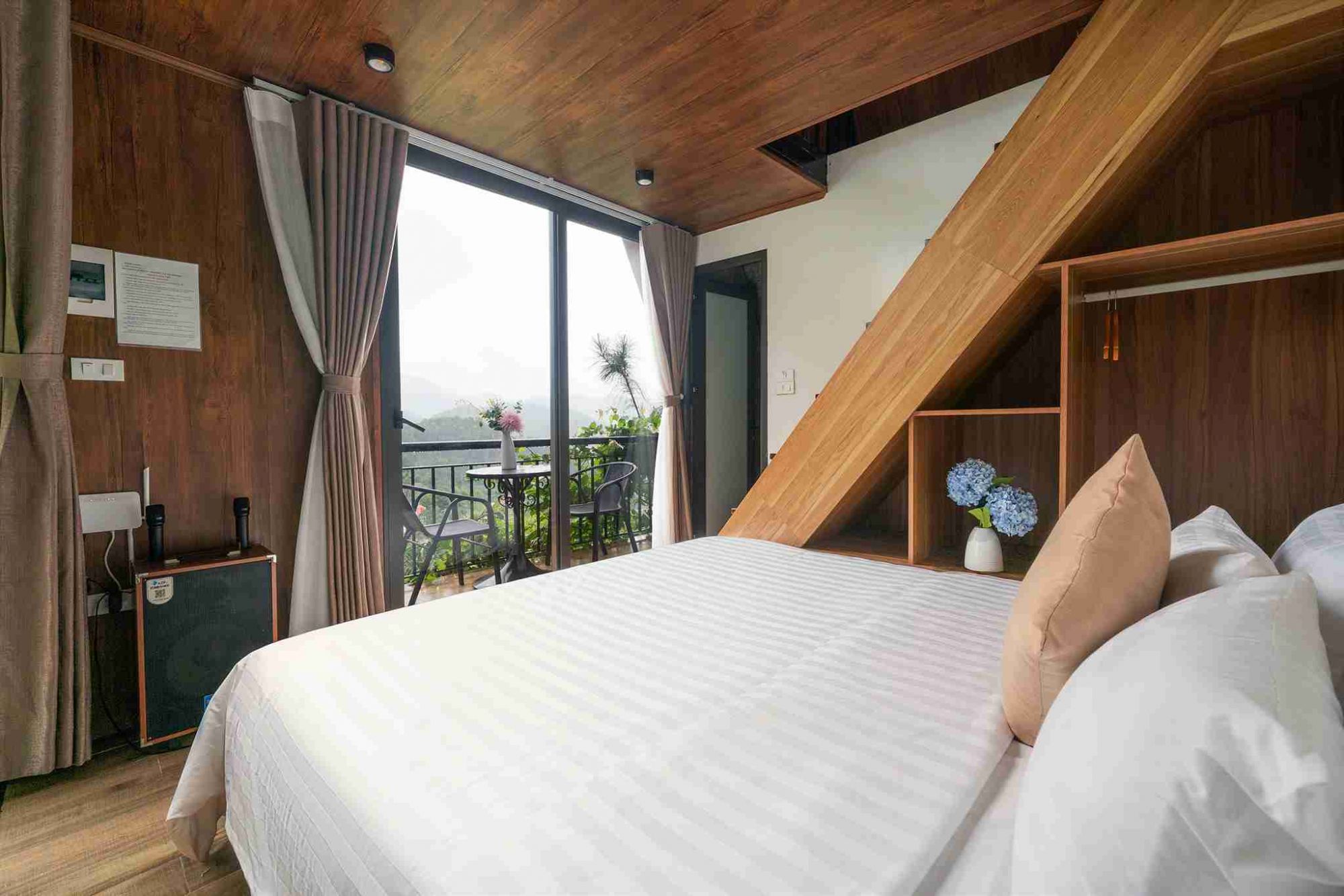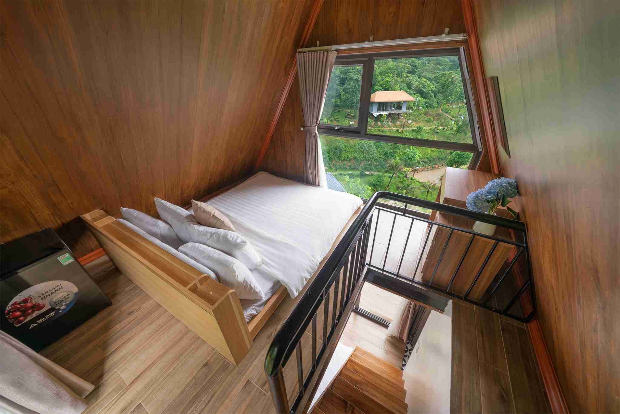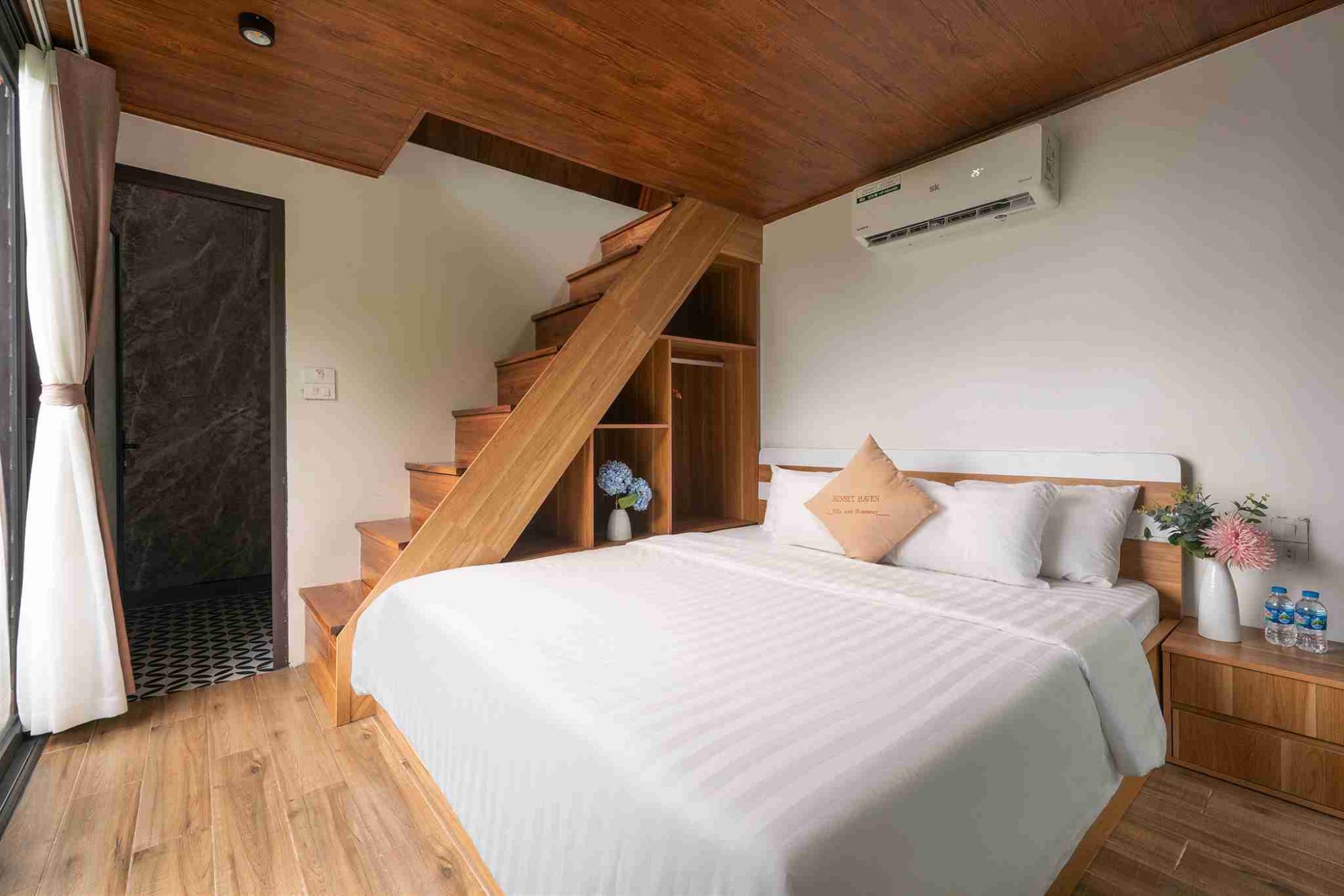 Phòng ngủ: Tầng trên có hai phòng ngủ khép kín. Phòng thứ nhất trang bị một giường 1m8x2m. Phòng thứ hai cũng có một giường 1m8x2m, kèm khoảng trống để thêm đệm phụ khi cần. Cả hai phòng đều có ban công riêng với bàn ghế, nơi bạn có thể thư giãn và tận hưởng không khí trong lành.