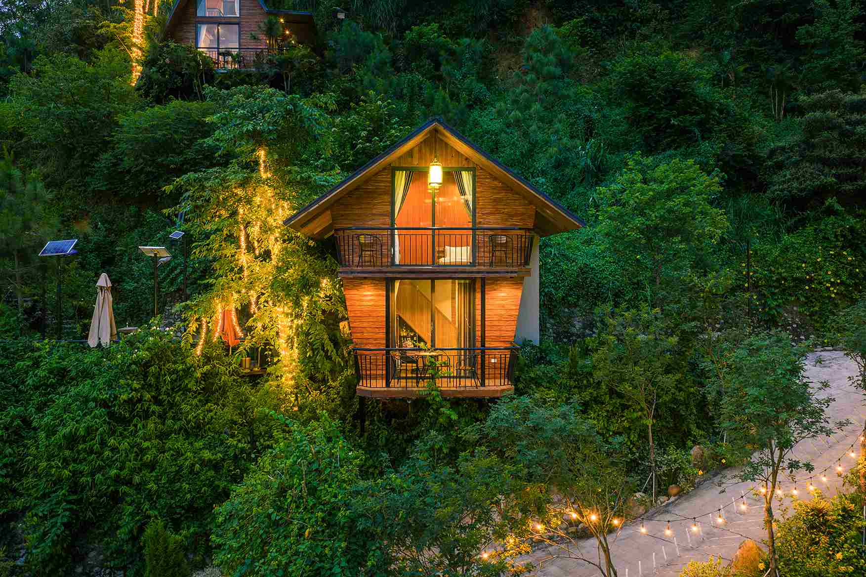 Sunset Haven - Cher House 5, ngôi nhà gỗ độc đáo, ẩn mình giữa cánh rừng xanh mát. Với thiết kế mái tam giác lạ mắt, Bungalow Cher 5 mang đến cảm giác vừa ấm cúng, vừa hiện đại, hứa hẹn một kỳ nghỉ khó quên cho những ai yêu thích sự yên tĩnh và gần gũi với thiên nhiên.