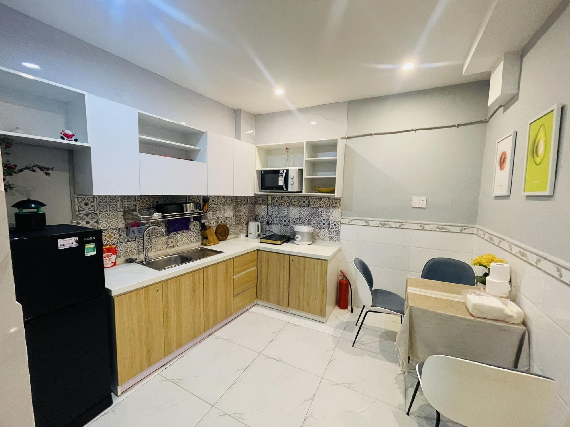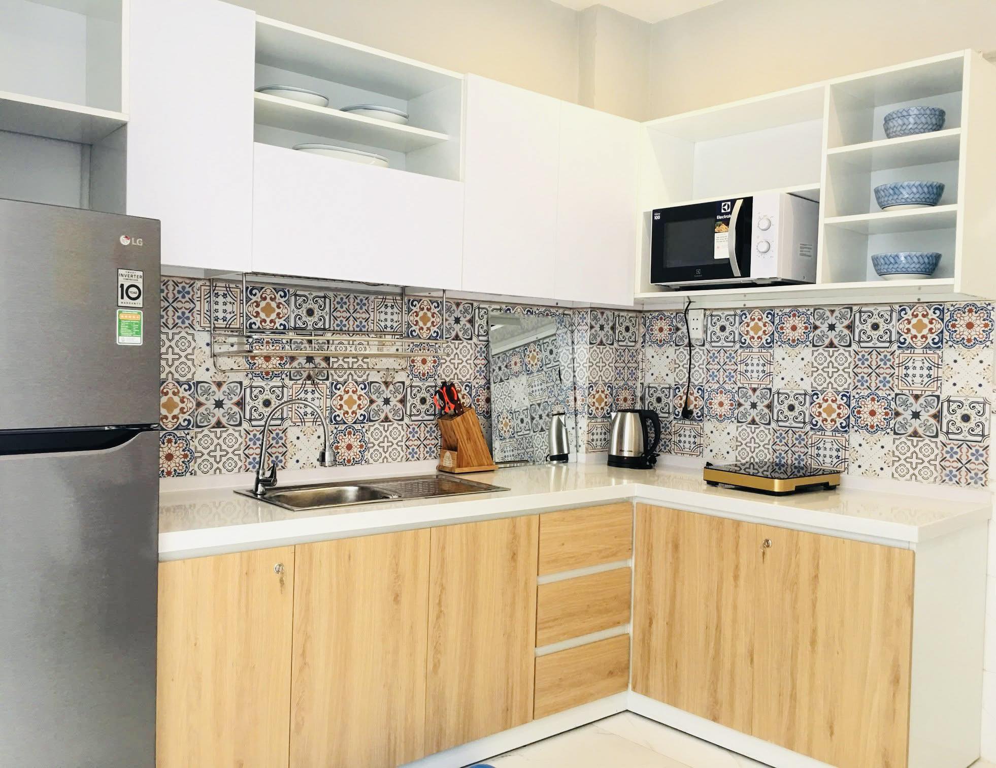 Việc có sẵn khu bếp riêng giúp sinh hoạt trở nên linh hoạt hơn, đặc biệt phù hợp với những kỳ lưu trú dài hạn.