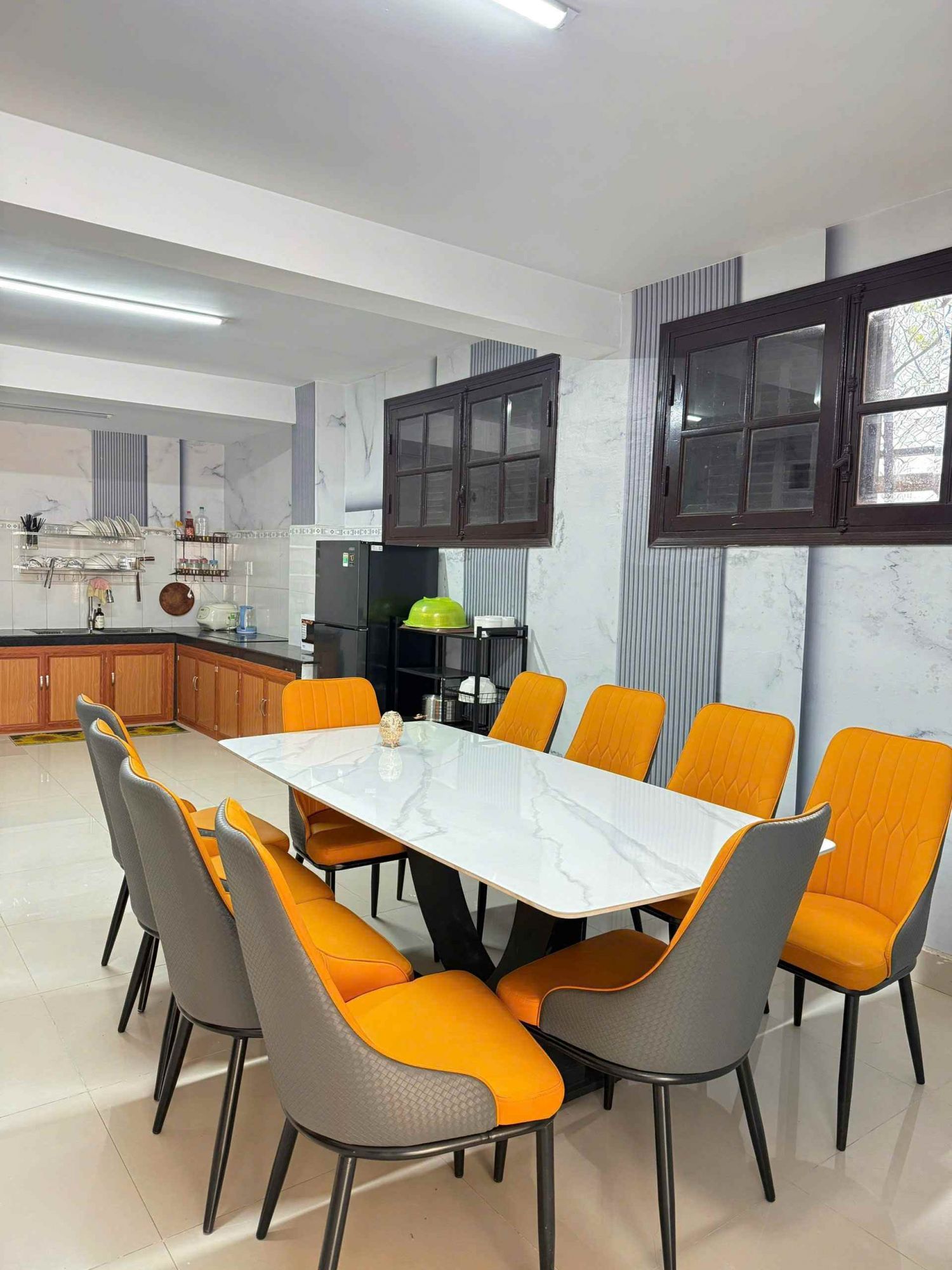 Một trong những điểm nổi bật của Villa Hùng Vương Đà Lạt chính là khu bếp được trang bị đầy đủ như một căn hộ cao cấp. Không gian rộng cho nhóm từ 10 đến 20 người sử dụng thoải mái với các vật dụng thiết yếu như lò nướng, lò vi sóng, tủ lạnh, gia vị cơ bản và bộ dụng cụ nấu ăn đồng bộ. Nhóm khách có thể tự tổ chức nấu nướng hoặc kết hợp tiệc tối ngay tại villa.
