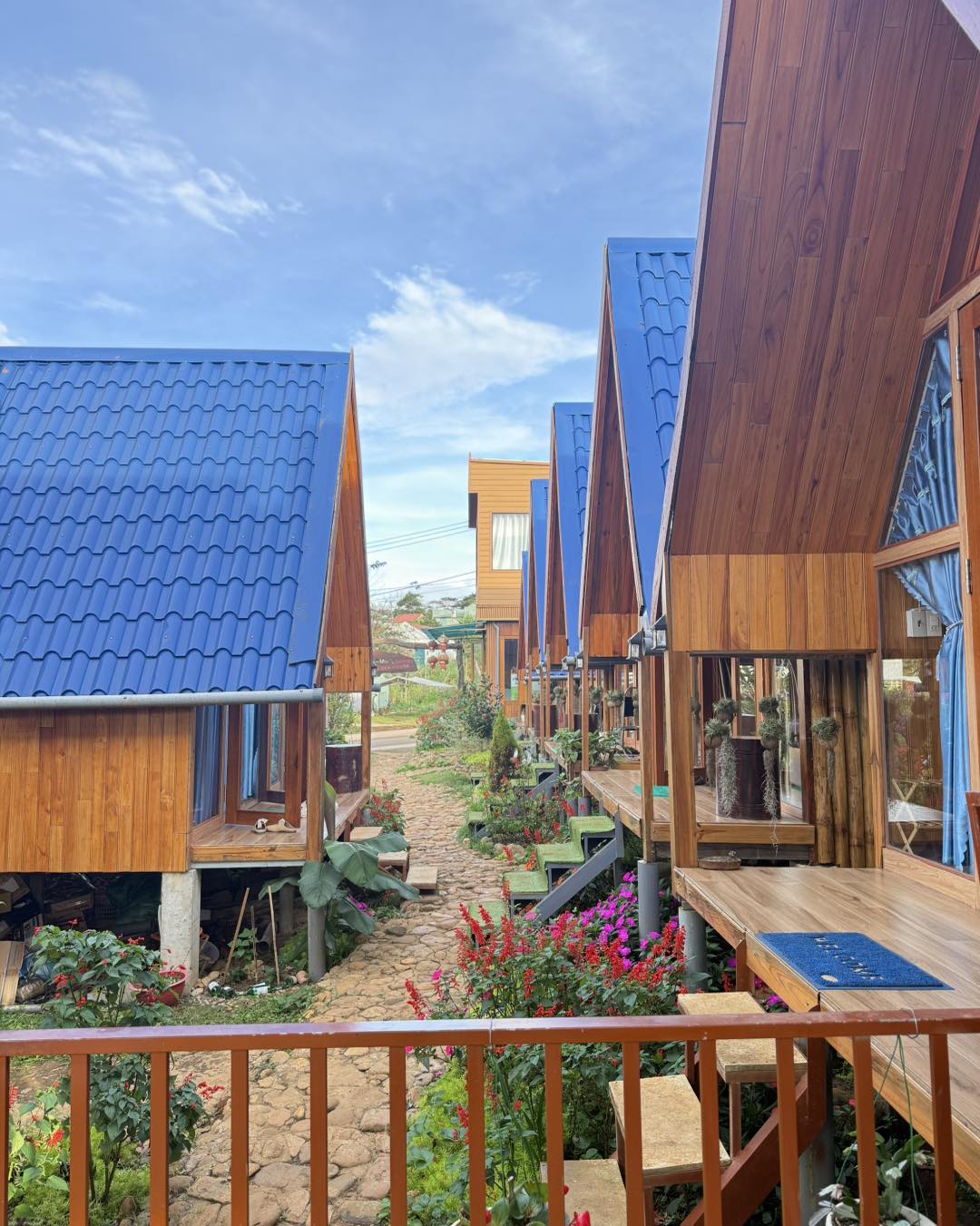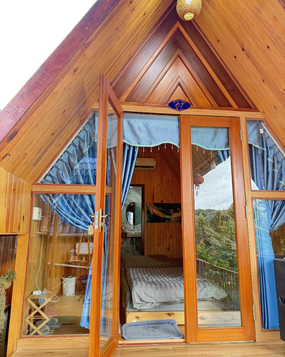 Mỗi bungalow riêng biệt được thiết kế mộc mạc từ gỗ tự nhiên, tạo cảm giác ấm áp như ngôi nhà nhỏ giữa rừng. Xung quanh là sân vườn mênh mông với cây cối um tùm, lối đi rải sỏi và những góc ngồi chill dưới tán lá, mang đến sự riêng tư hoàn hảo để thư giãn hoặc trò chuyện bên bạn bè.