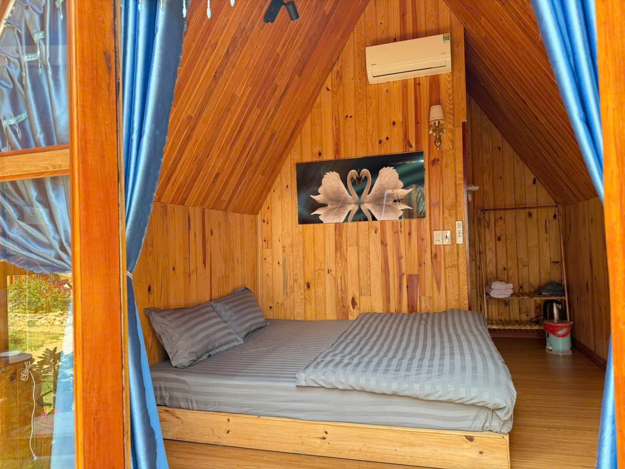 Các bungalow được trang bị giường êm ái, Wi-Fi miễn phí, và phòng tắm riêng với nước nóng. Nội thất gỗ đơn giản kết hợp bàn trà nhỏ và ban công hướng vườn, giúp bạn dễ dàng hòa mình vào thiên nhiên mà vẫn tiện nghi đầy đủ.