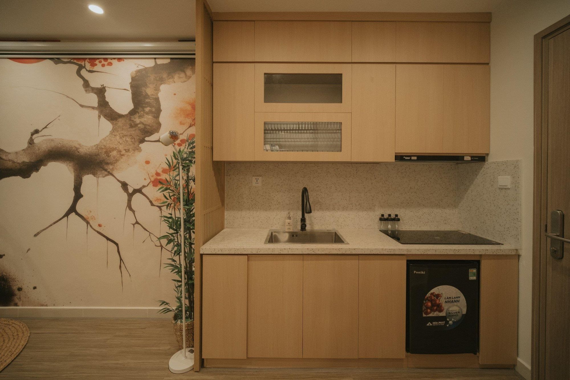 • Bếp nhỏ xinh đầy đủ tiện nghi: Được trang bị đầy đủ dụng cụ để bạn có thể thoải mái nấu những món ăn yêu thích – dù là bữa sáng đơn giản hay bữa tối ấm cúng bên người thân.
