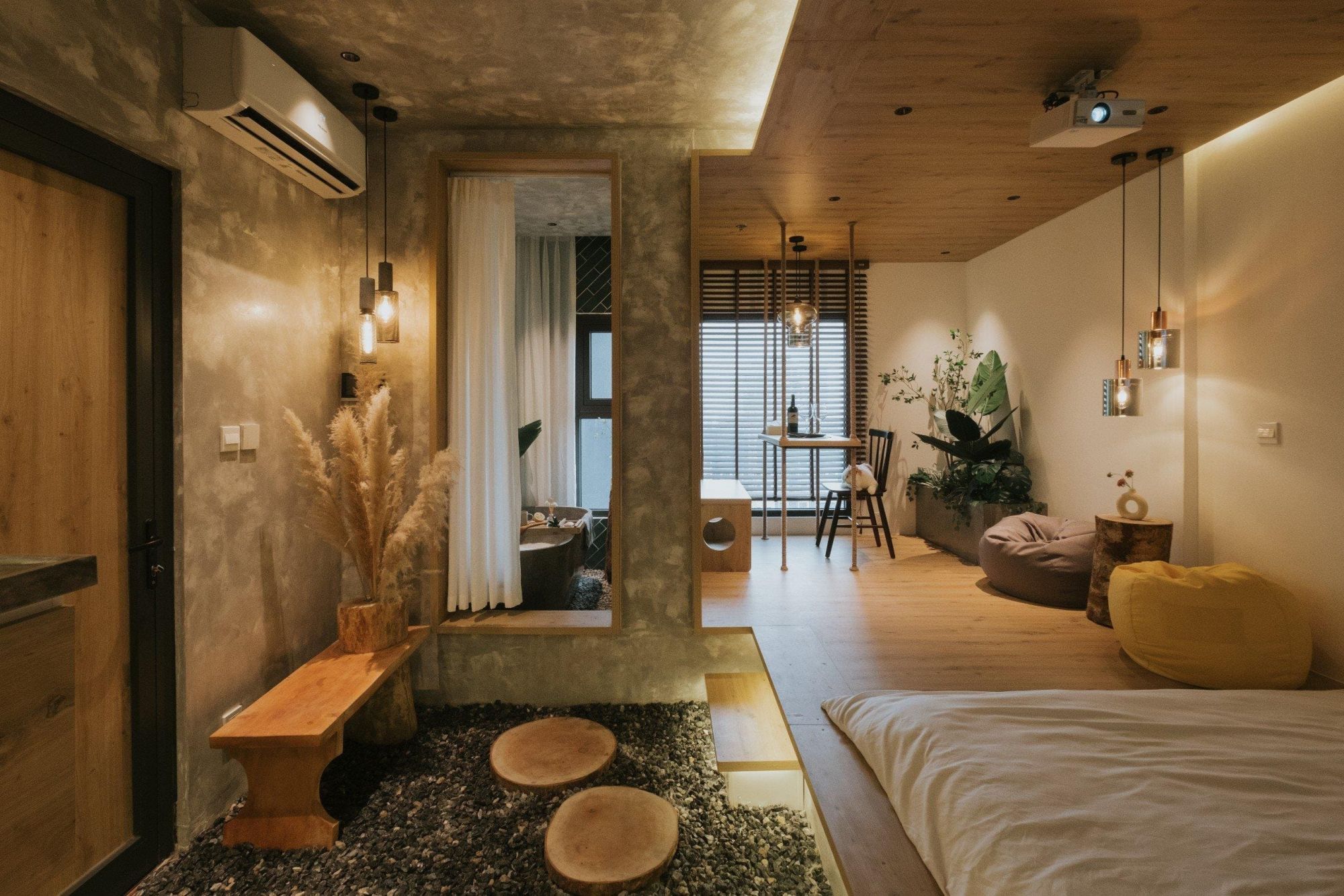 Nội thất gỗ tự nhiên được lựa chọn kỹ lưỡng, kết hợp cùng đá và cây xanh tạo cảm giác gần gũi nhưng vẫn rất tinh tế.