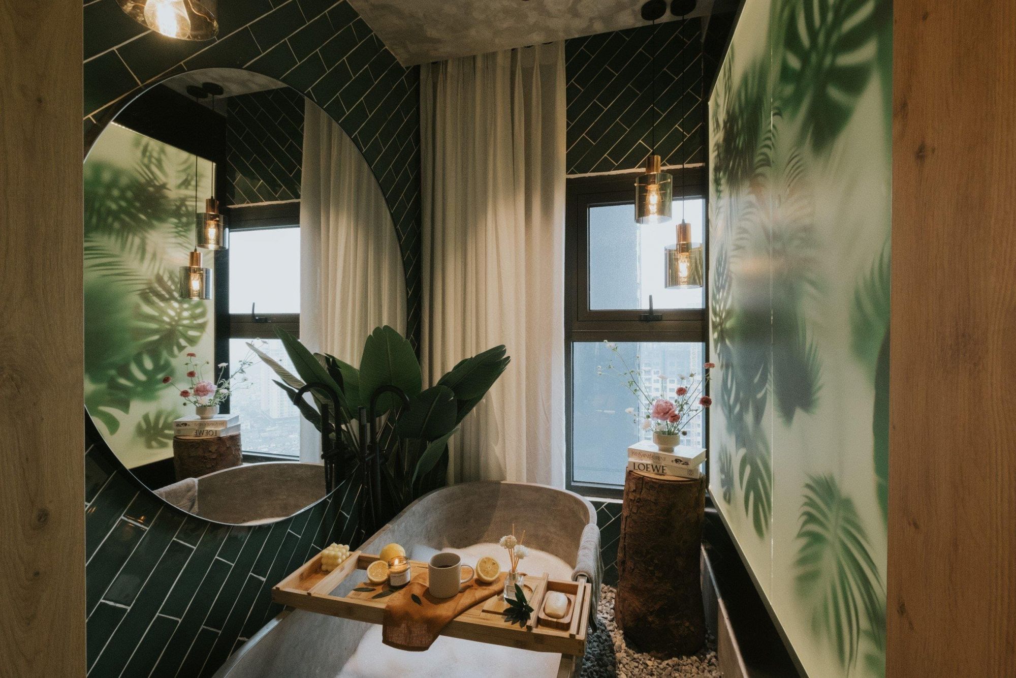 Điểm nhấn độc đáo của căn hộ chính là bồn tắm đặt giữa không gian mở, nằm cạnh khung cửa sổ lớn. Bạn có thể ngâm mình trong làn nước ấm, thư giãn giữa ánh sáng tự nhiên, vừa ngắm nhìn bầu trời xanh bên ngoài. Trải nghiệm này không chỉ mang tính thẩm mỹ mà còn giúp giải tỏa căng thẳng, phục hồi năng lượng sau những ngày dài.