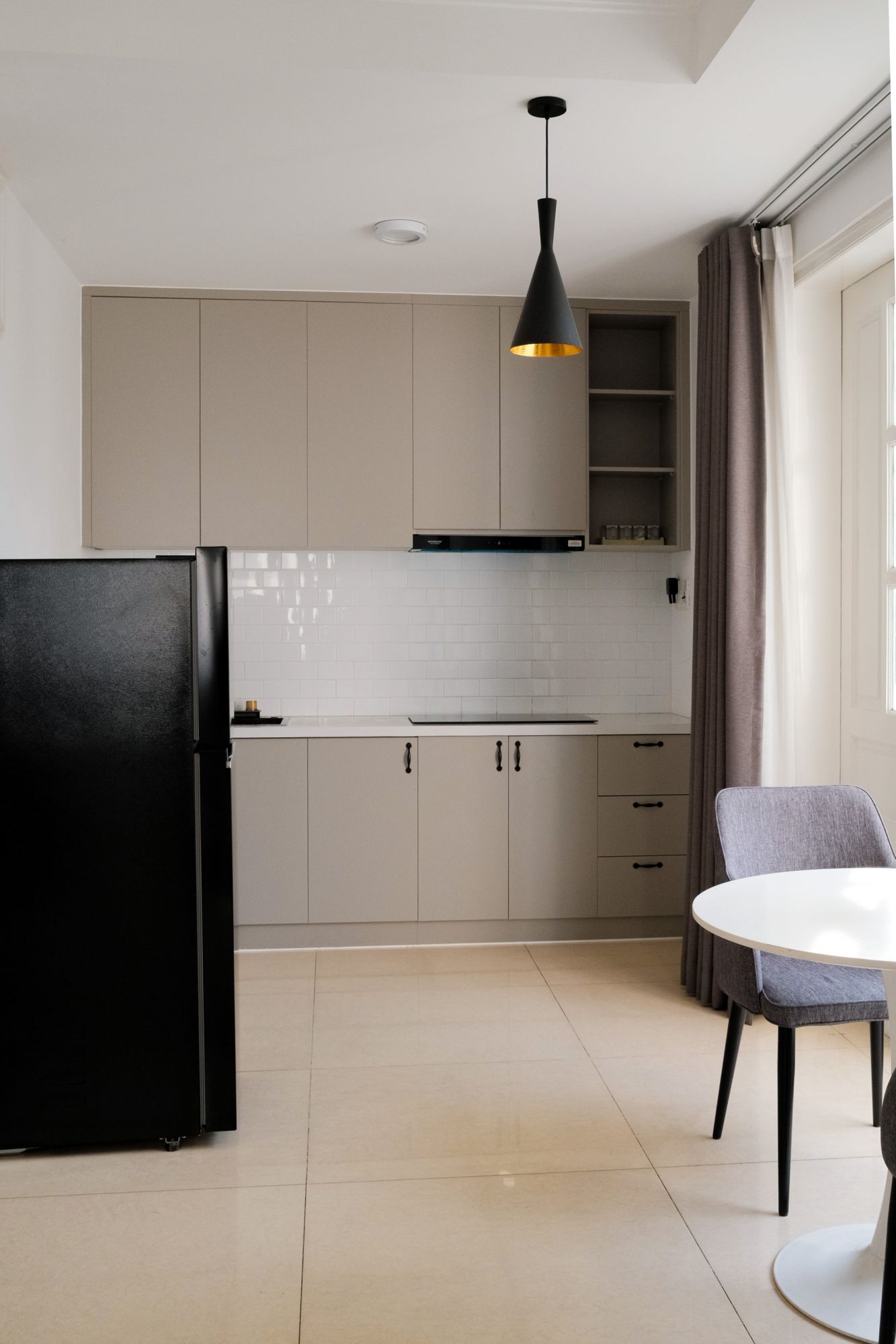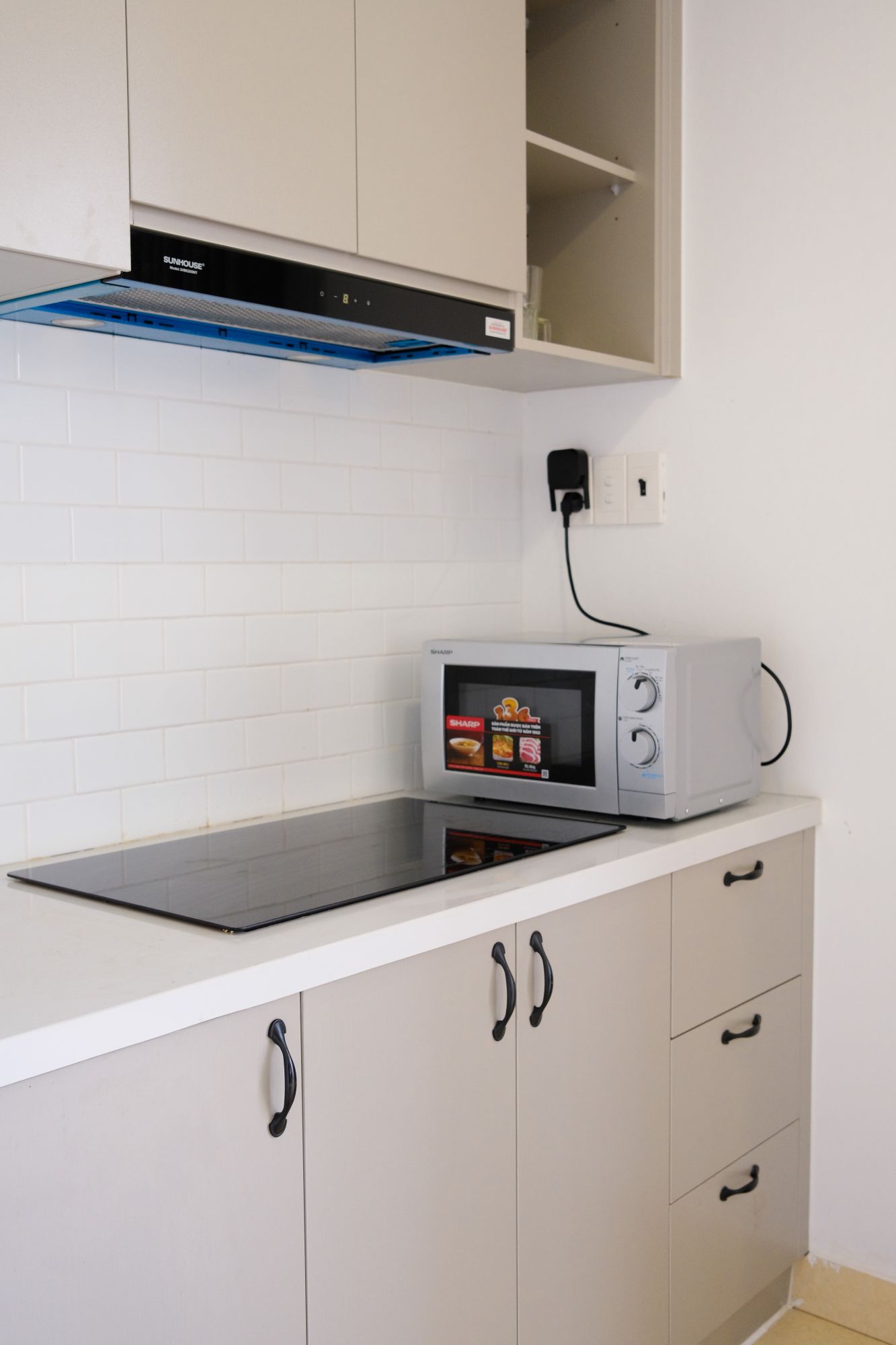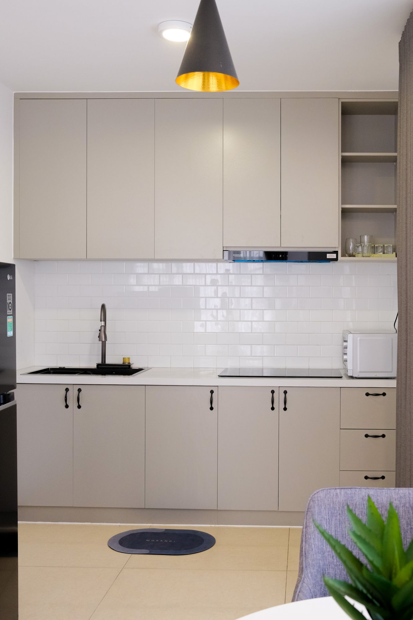 Mỗi căn hộ được trang bị bếp riêng hiện đại với bếp từ, lò vi sóng, tủ lạnh lớn và dụng cụ nấu nướng đầy đủ, giúp bạn tự do chuẩn bị bữa ăn gia đình. Phòng khách rộng rãi với sofa êm ái, TV lớn và bàn ăn, là nơi lý tưởng để thư giãn, làm việc hoặc quây quần bên nhau sau ngày dài khám phá Sài Gòn.