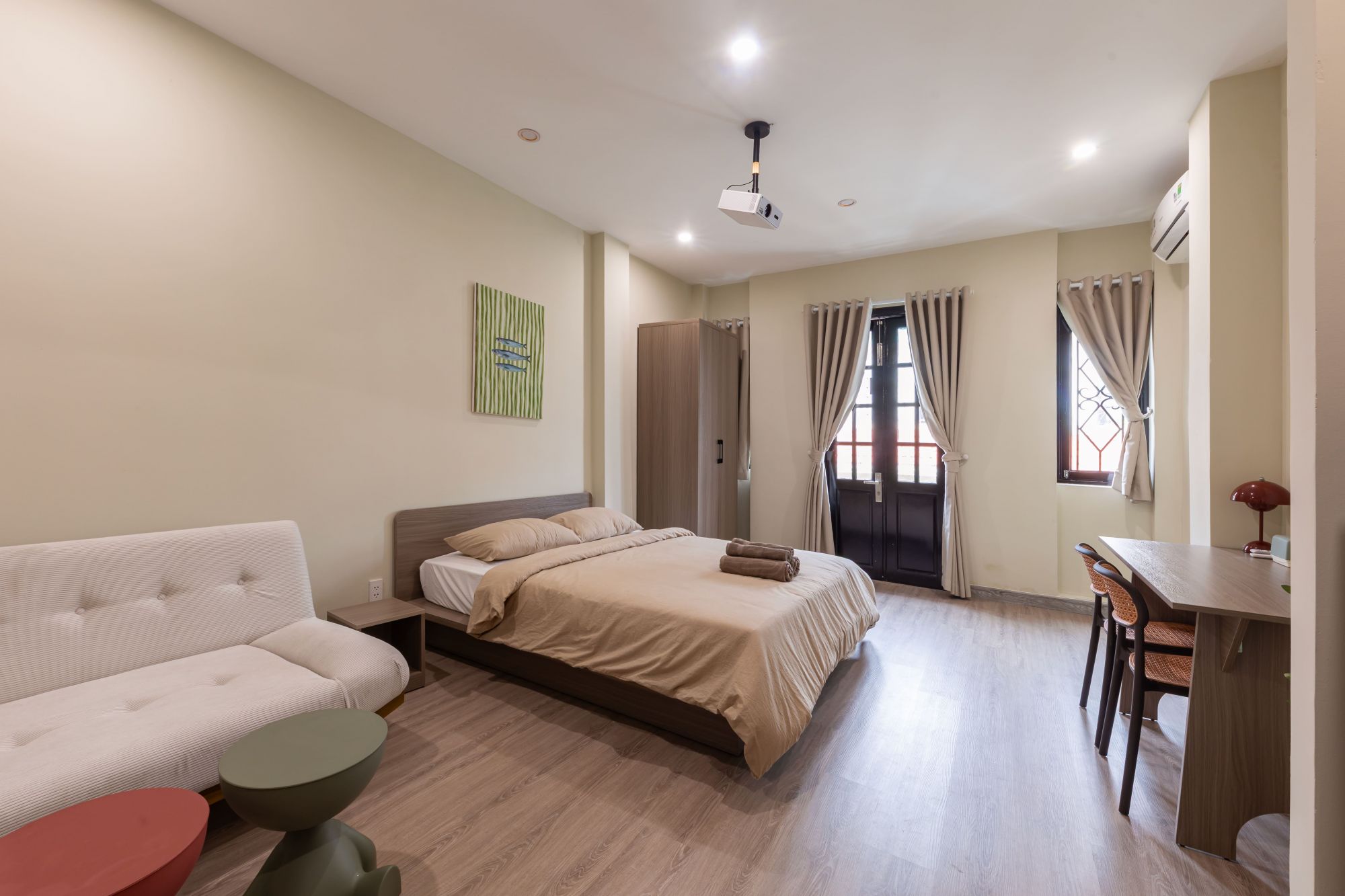 Phòng tuy không lớn nhưng được bố trí thông minh, đảm bảo đầy đủ các khu vực chức năng từ nơi nghỉ ngơi, làm việc đến góc thư giãn bên cửa sổ hoặc ban công.