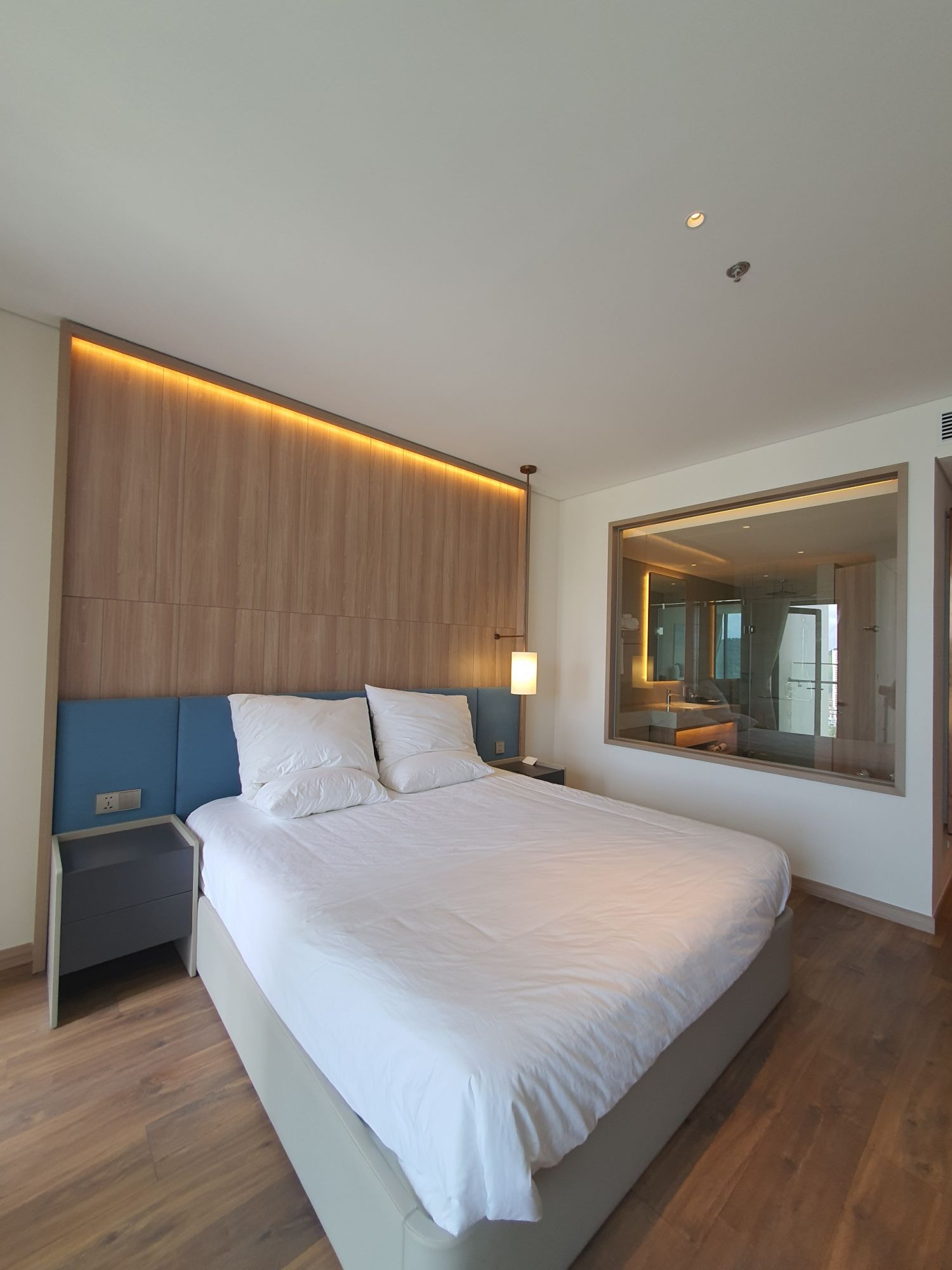 Phòng nghỉ hiện đại: Các căn hộ được trang bị đầy đủ điều hòa, bếp tiện nghi (có tủ lạnh, lò vi sóng, ấm đun nước) và TV màn hình phẳng.
