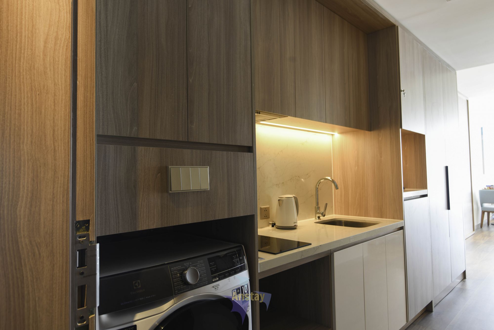 Phòng nghỉ hiện đại: Các căn hộ được trang bị đầy đủ điều hòa, bếp tiện nghi (có tủ lạnh, lò vi sóng, ấm đun nước) và TV màn hình phẳng.
