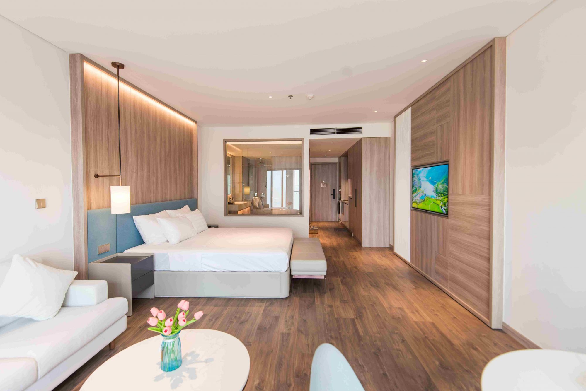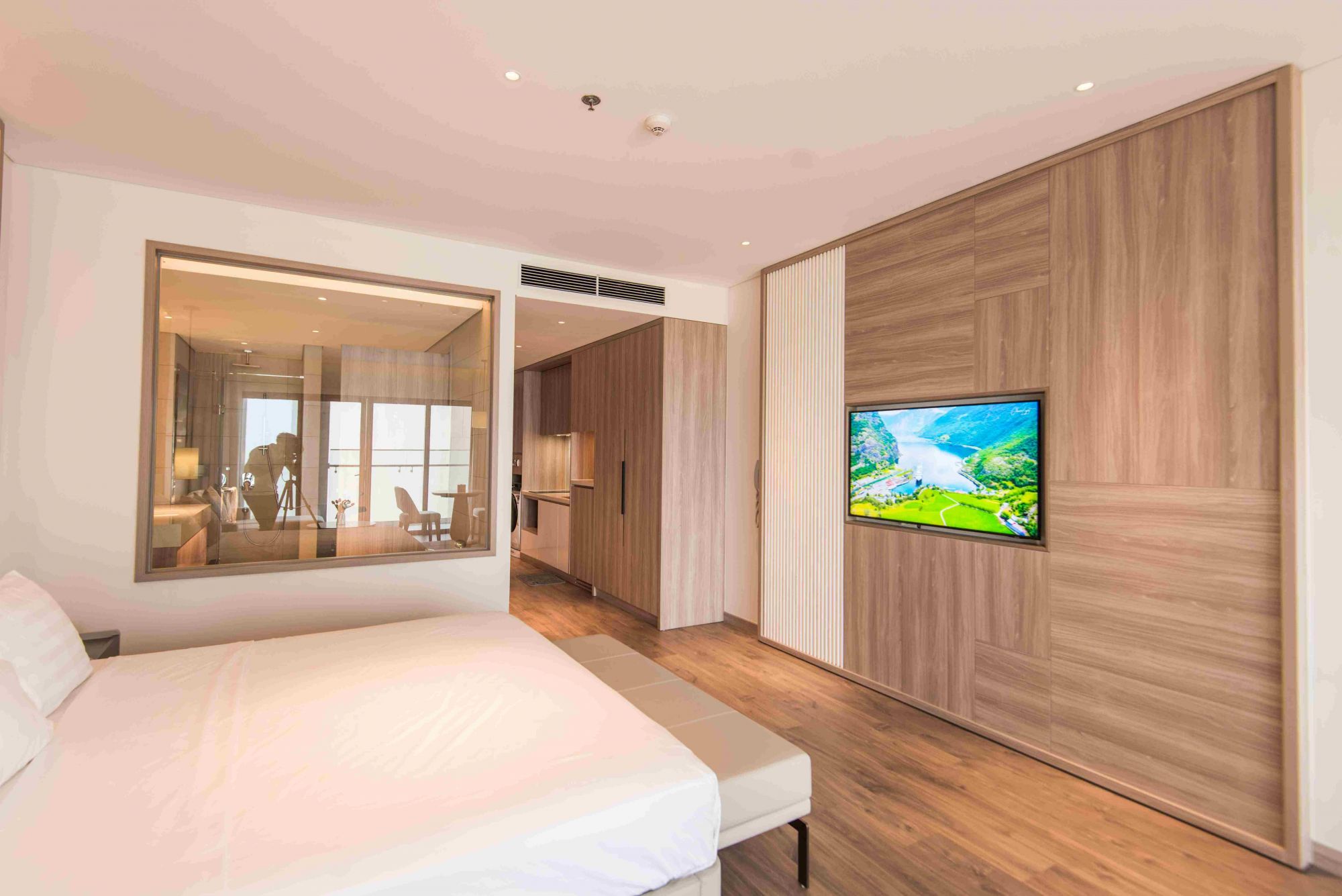 • Phòng nghỉ hiện đại: Các căn hộ được trang bị đầy đủ điều hòa, bếp tiện nghi (có tủ lạnh, lò vi sóng, ấm đun nước) và TV màn hình phẳng.