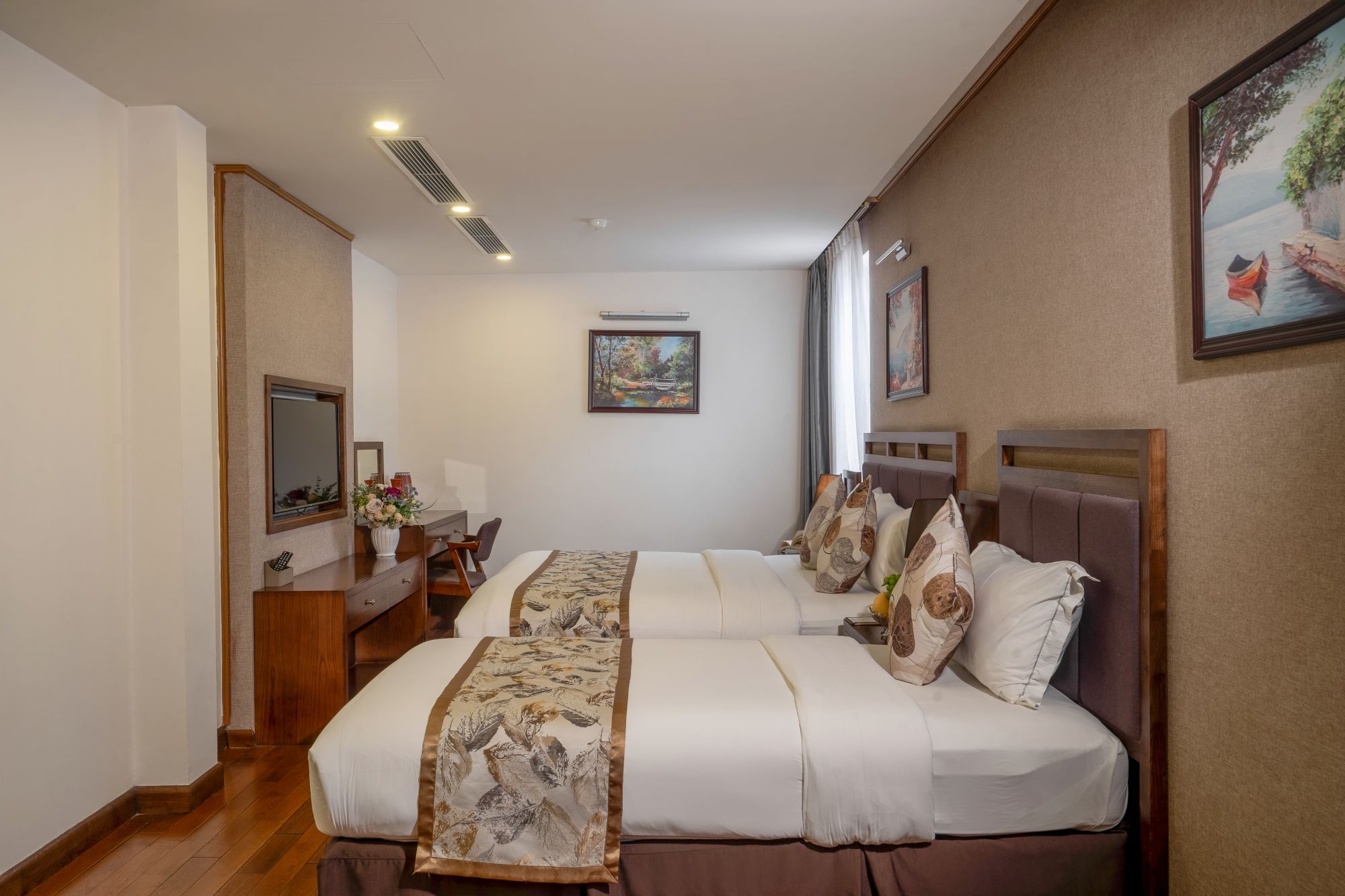 Các phòng tại Sapa Legend Hotel có bố cục mạch lạc, tách bạch rõ khu vực nghỉ ngơi và khu vực sinh hoạt. Bàn làm việc, bàn trang điểm và khu vực đặt hành lý được sắp xếp dọc theo không gian, tạo lối đi thoáng và thuận tiện. Những khung cửa sổ lớn với rèm sáng màu giúp ánh sáng tự nhiên tràn vào, khiến căn phòng không bị nặng dù sử dụng gam màu trầm.