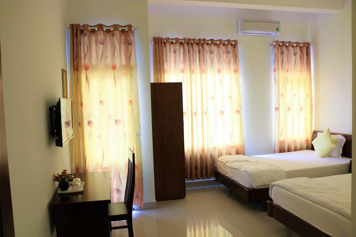 Phòng nghỉ tại khách sạn được giữ gìn sạch sẽ, bố trí đầy đủ tiện nghi cơ bản, đáp ứng nhu cầu lưu trú ngắn hoặc dài ngày. Một số phòng có ban công riêng, đón gió tự nhiên và ánh sáng dịu nhẹ, mang lại cảm giác thoáng đãng, dễ chịu sau một ngày khám phá thành phố.