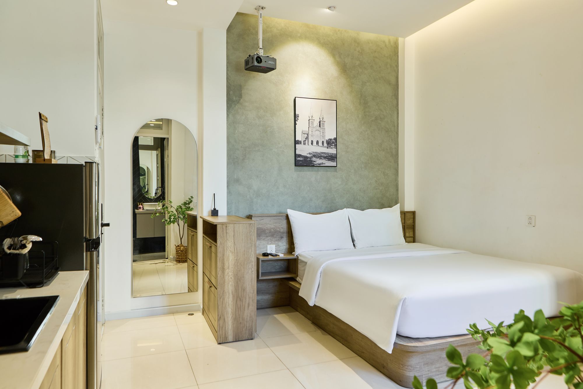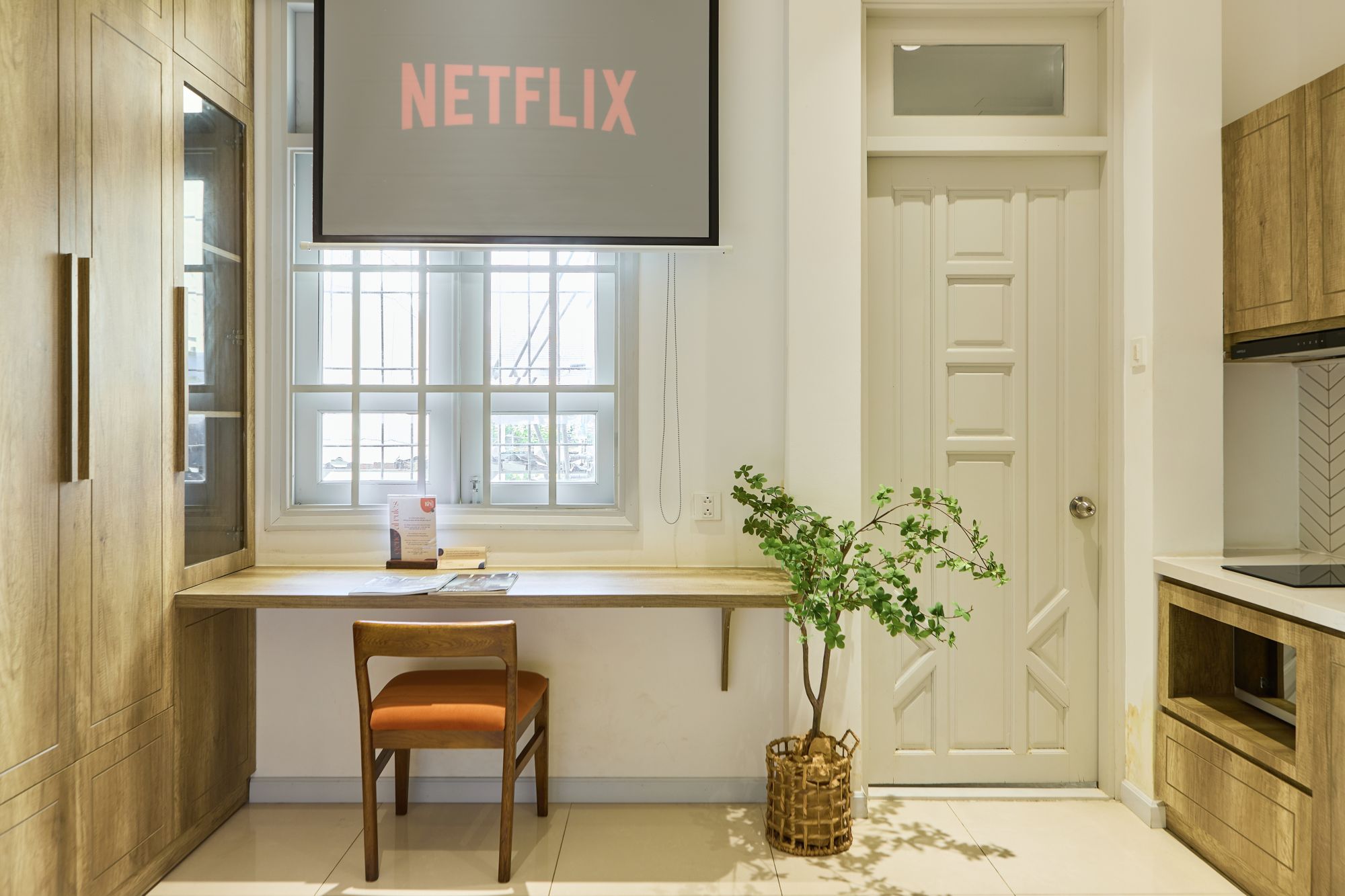 Một điểm cộng nổi bật của Kin Wander Tân Quy là tất cả các phòng đều được trang bị máy chiếu kèm Netflix. Trải nghiệm xem phim, thưởng thức series yêu thích hay đơn giản là bật một chương trình giải trí vào buổi tối trở nên riêng tư và thoải mái hơn hẳn so với các hình thức lưu trú thông thường. Không cần di chuyển, không gian phòng ngủ có thể nhanh chóng biến thành một “rạp chiếu phim mini” đúng nghĩa.
