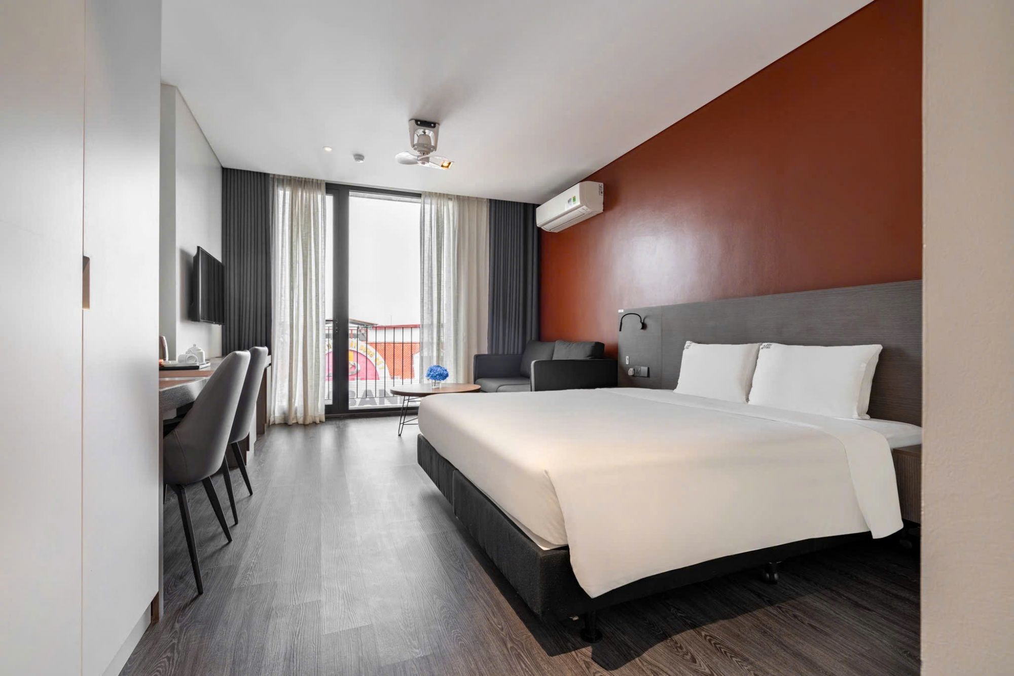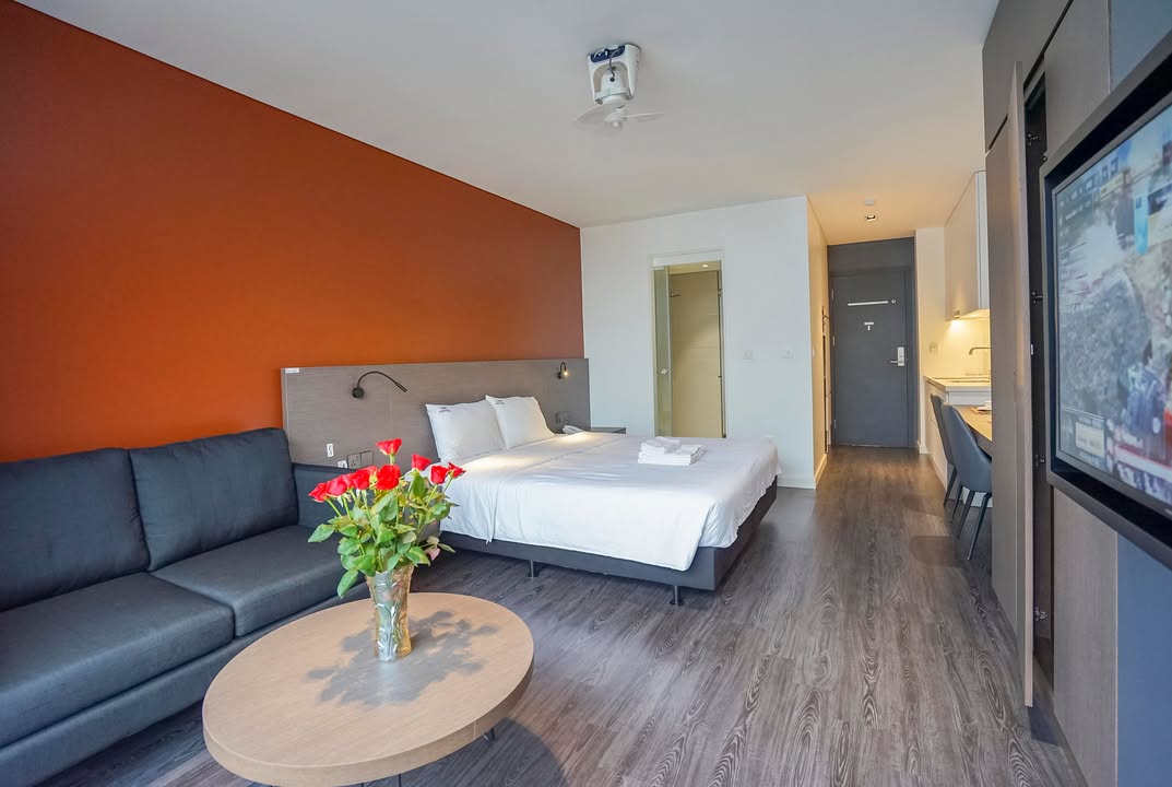 Khách sạn thiết kế hiện đại với tổng số 39 phòng nghỉ tiện nghi, gồm nhiều hạng phòng phù hợp cho nhu cầu ngắn hạn, dài hạn hoặc công tác. Mỗi phòng được trang bị đầy đủ tiện ích như khu bếp, ban công, máy giặt – máy sấy, sofa, bàn ăn và phòng tắm chuẩn châu Âu với sen cây điều chỉnh nhiệt độ, mang đến không gian nghỉ dưỡng thoải mái và tiện nghi.