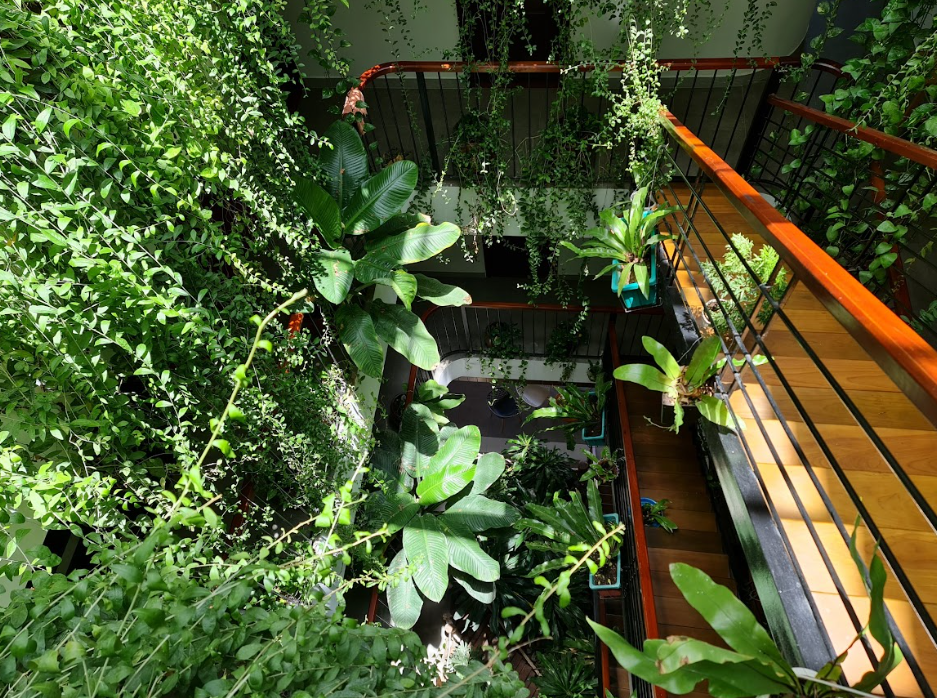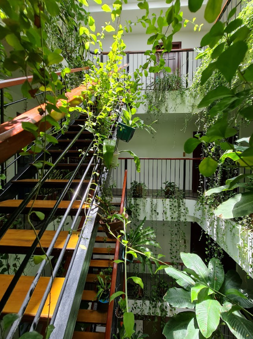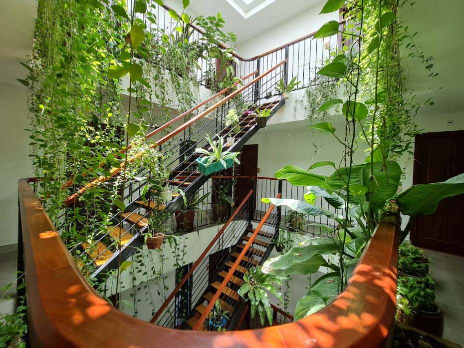 Từ ngoài cổng đã thấy rất nhiều loại cây xanh… phủ kín tường, mái hiên và hành lang. Bên trong, cây xanh được decor khắp nơi: cây lớn trong sảnh, dây leo trùm ban công, chậu cây nhỏ đầu giường – biến mỗi góc thành không gian sống chậm, mát mẻ và tràn ngập oxy.