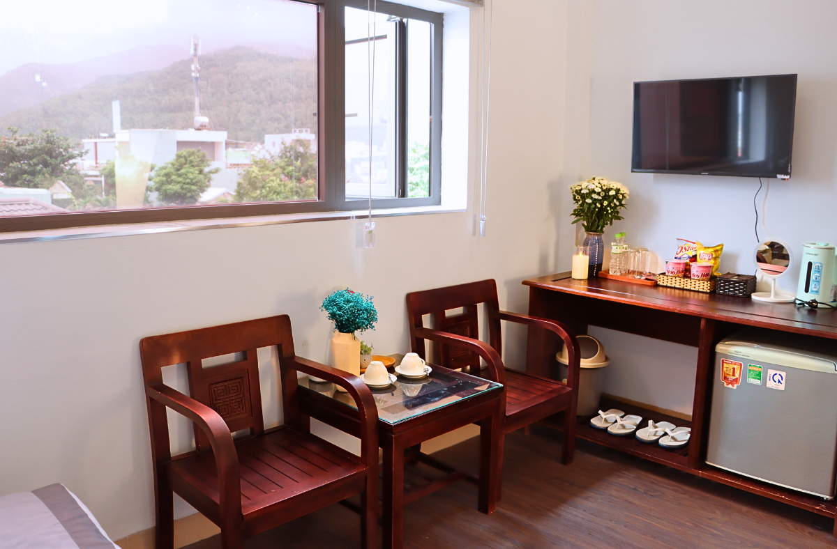 Không gian phòng được thiết kế đơn giản, tinh tế với tông màu nhẹ nhàng, cửa sổ đón ánh sáng tự nhiên và trang bị đầy đủ tiện nghi như điều hòa, tủ lạnh, TV màn hình phẳng và phòng tắm riêng sạch sẽ. Mỗi phòng đều mang lại cảm giác thư thái, thoải mái như ở nhà.