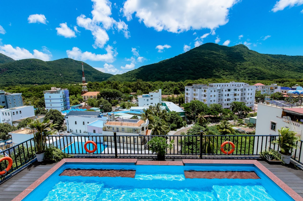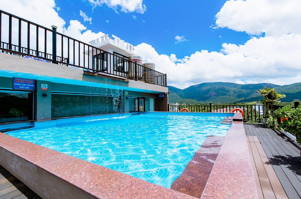 Bể bơi rooftop là điểm nhấn không thể bỏ qua: làn nước trong xanh, ghế nằm trắng tinh, quầy bar ngay bên hồ – nơi bạn có thể vừa bơi vừa ngắm toàn cảnh Côn Đảo, từ biển xanh mênh mông đến núi Chúa buổi hoàng hôn đỏ rực.