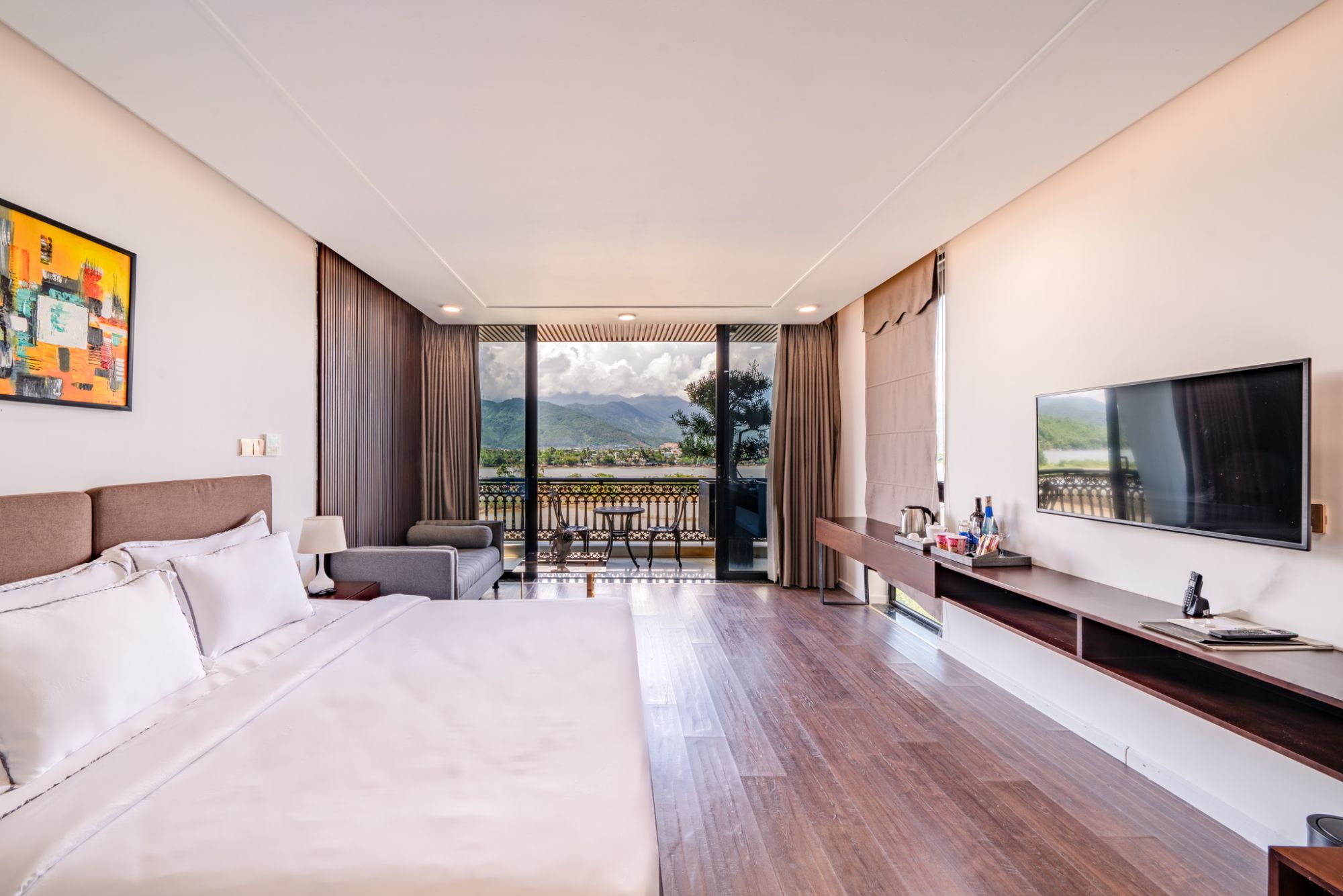 Khuôn viên được bao phủ bởi nhiều mảng xanh, thiết kế hài hòa giữa nét mộc mạc và tiện nghi hiện đại, tạo cảm giác thư thái ngay từ khi đặt chân đến. Từ resort, du khách có thể tận hưởng bầu không khí trong lành, ngắm nhìn cảnh sông nước êm đềm và đón những khoảnh khắc bình minh, hoàng hôn rất đỗi bình yên.