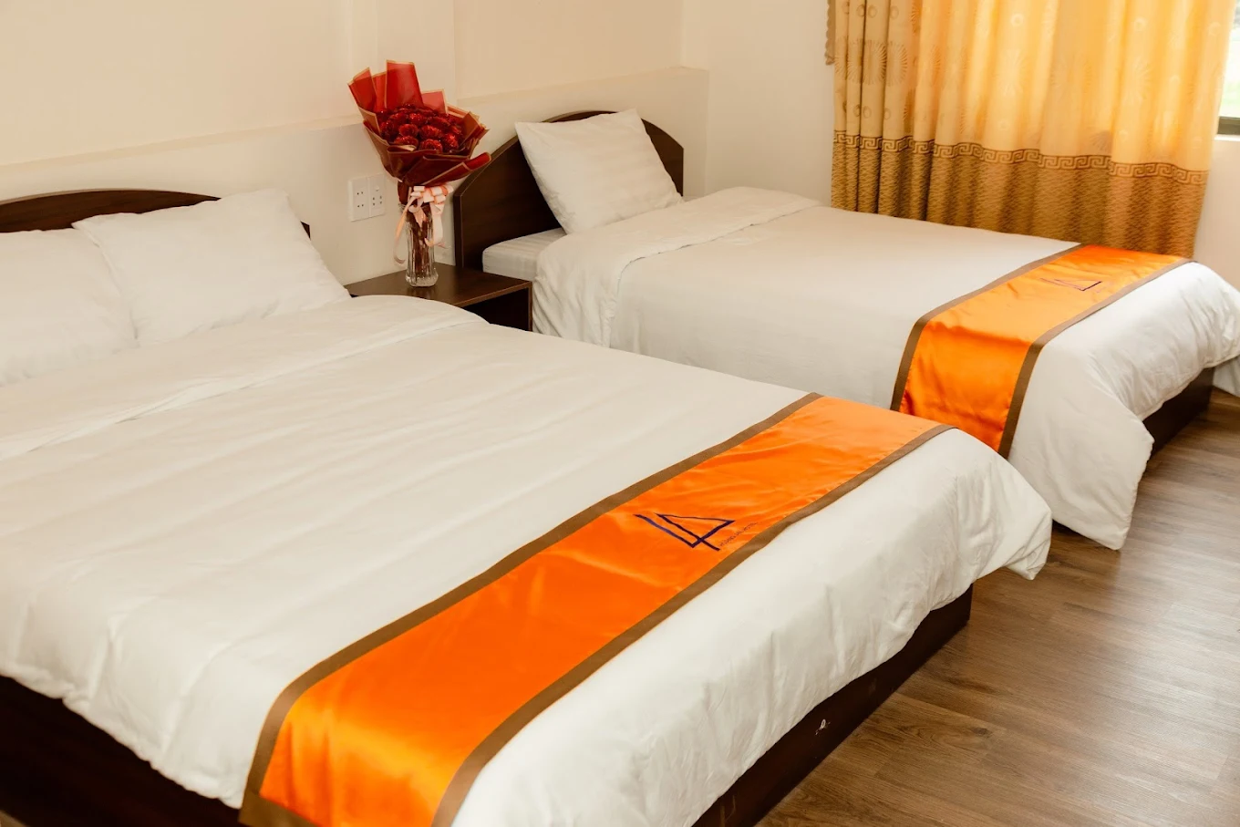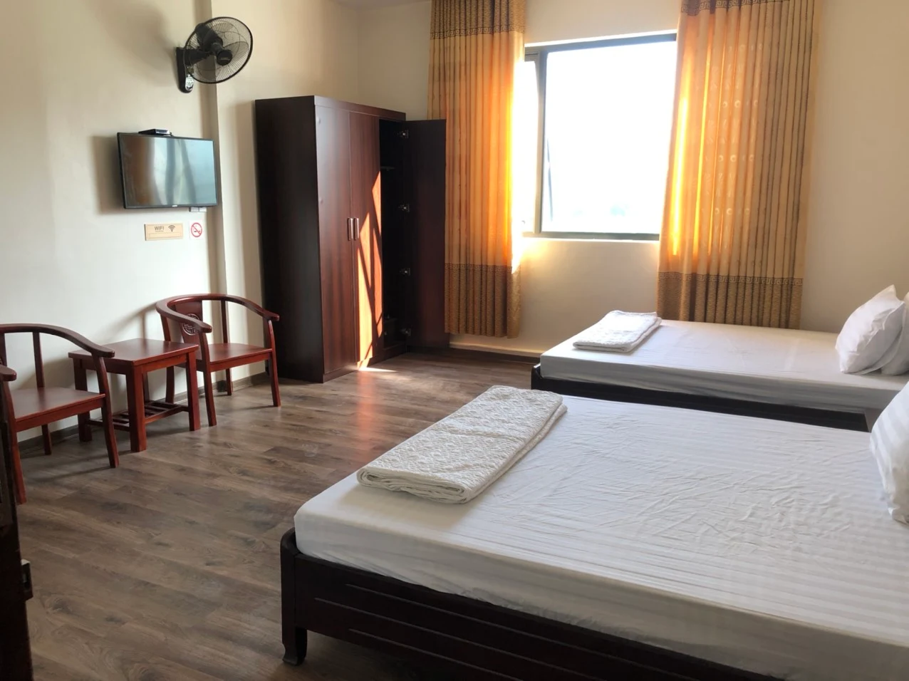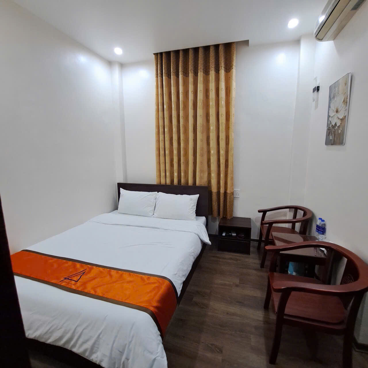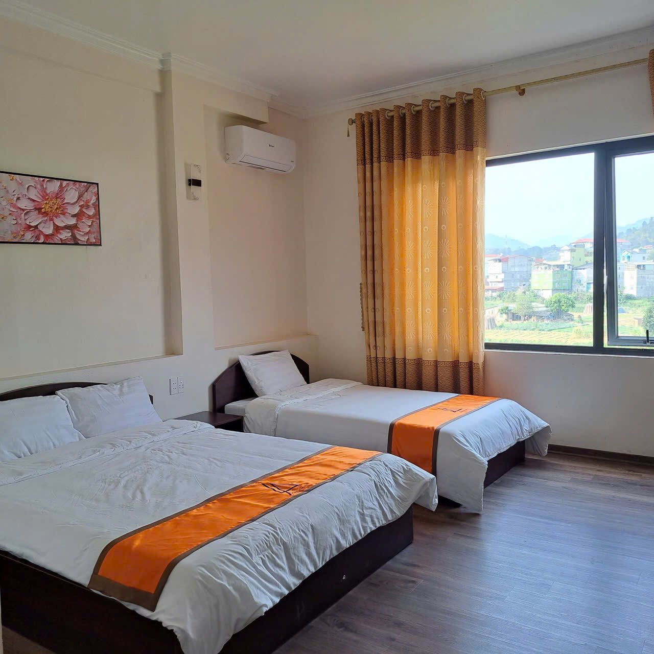 Phòng tại Hoàng An Hotel chú trọng sự gọn gàng và thoáng đãng. Tông màu sáng kết hợp với nội thất đơn giản khiến căn phòng như rộng hơn, phù hợp cả cho những đêm dừng chân ngắn lẫn các chuyến ở lại nhiều ngày. Giường ngủ đệm dày, ga gối sạch sẽ, mùi vải mới phảng phất giúp giấc ngủ sâu hơn sau một ngày di chuyển. Cửa sổ mở ra khung cảnh phố núi với mái nhà, hàng cây và ánh đèn vàng mỗi khi chiều xuống, tạo nên cảm giác vừa gần gũi đời sống địa phương, vừa giữ được sự riêng tư cần thiết. Trong phòng, ánh sáng được bố trí hợp lý để đọc sách, làm việc hoặc thư giãn, không gây chói hay tối bí.