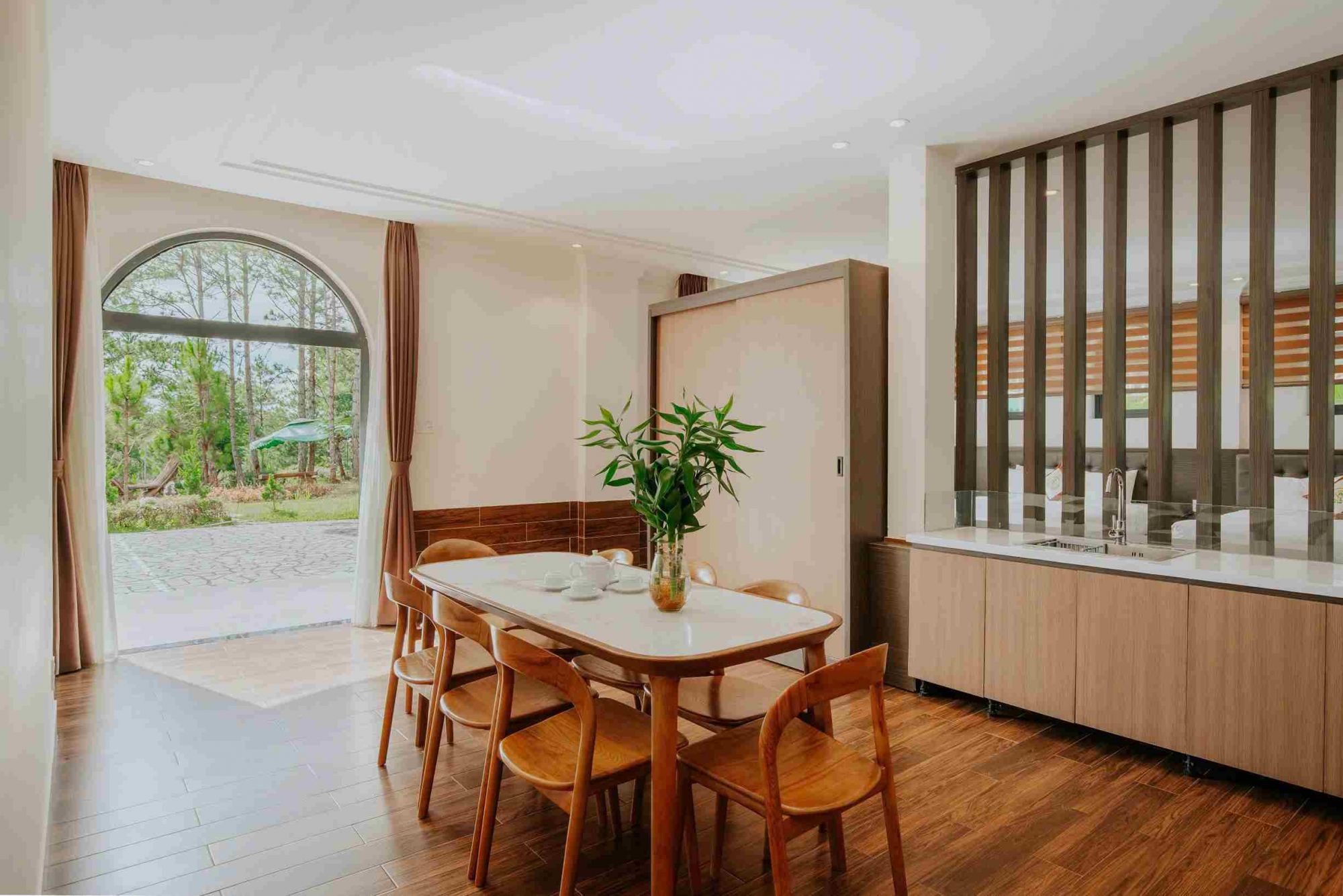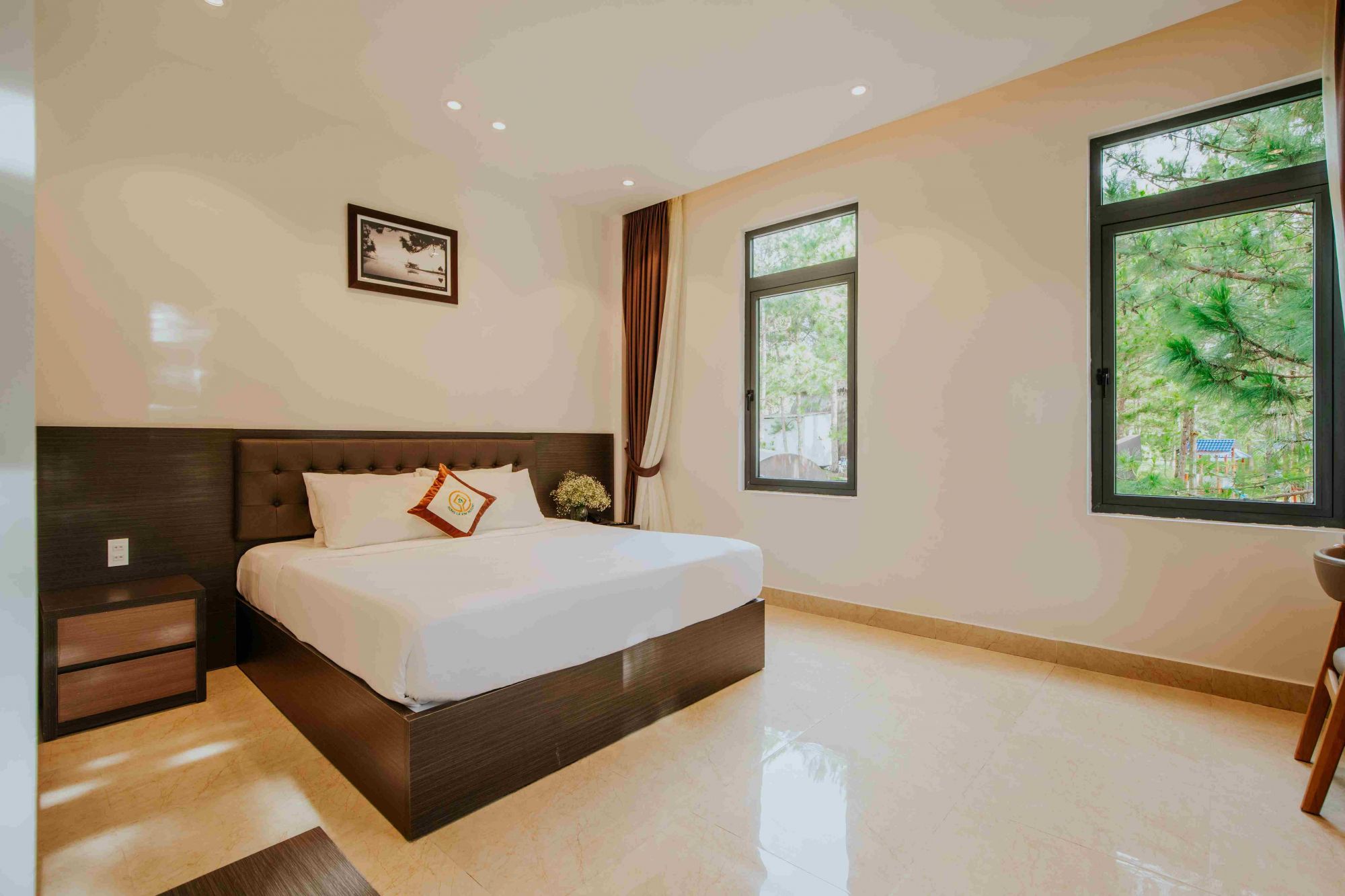 Các phòng tại resort được chăm chút với phong cách tinh giản, sử dụng nhiều chất liệu gỗ, tạo nên sự ấm cúng nhưng vẫn hiện đại. Từ cửa sổ, du khách có thể ngắm nhìn toàn cảnh rừng thông hay sân vườn xanh mướt – một trải nghiệm mang đậm chất Đà Lạt.