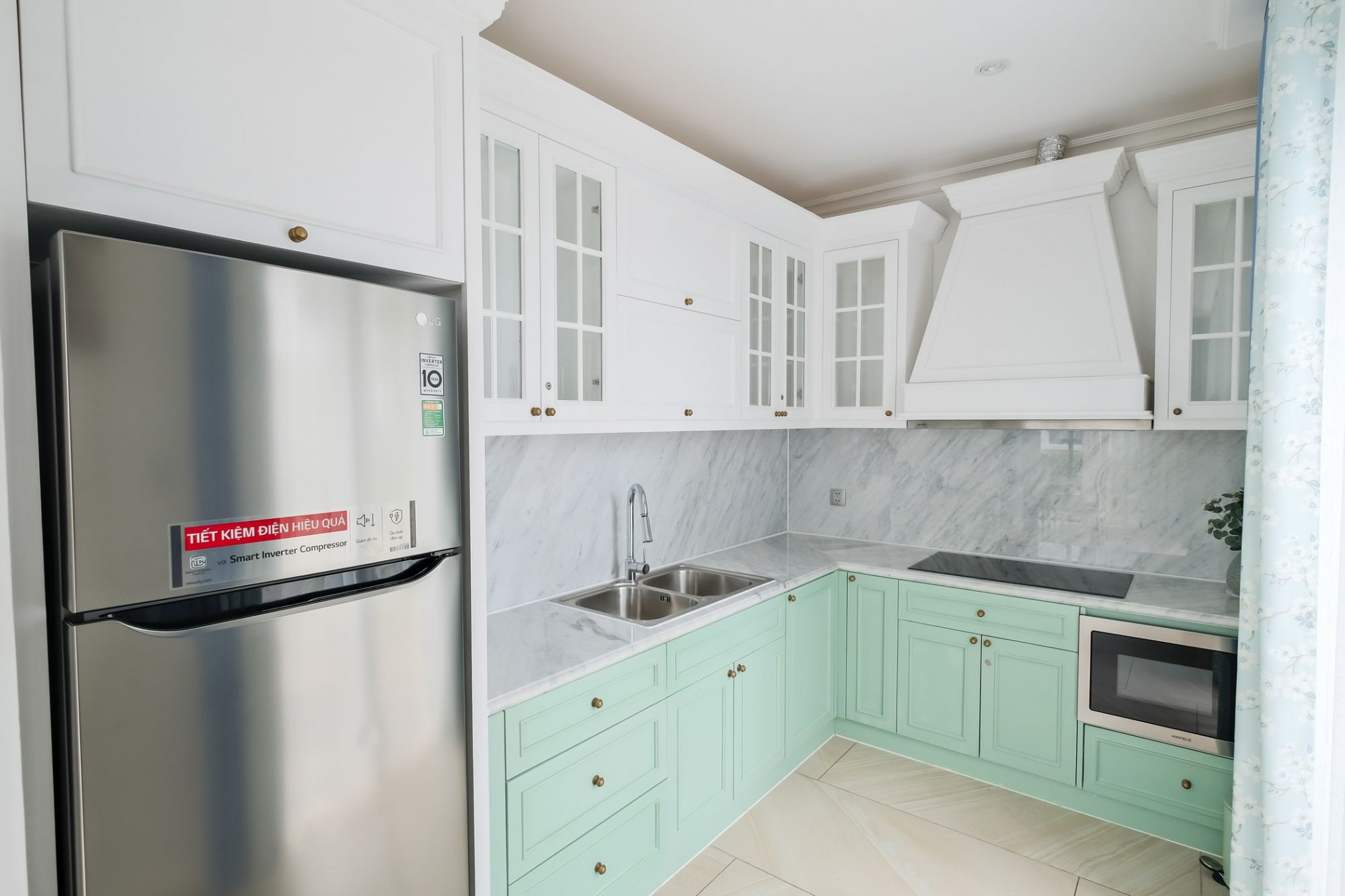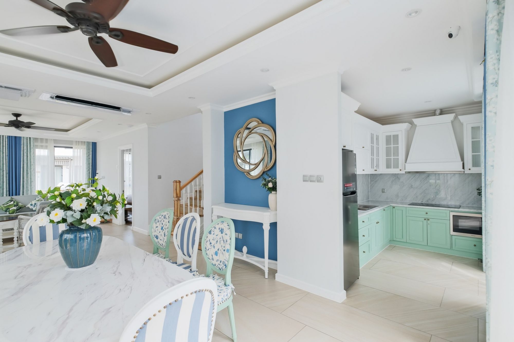 Khu sinh hoạt chung tại Villa 2PN thuộc Sunset Sanato Resort & Villa được tổ chức gọn gàng nhưng rất hiệu quả. Phòng khách, bàn ăn và bếp nằm trong cùng một trục không gian, đủ rộng để sinh hoạt chung nhưng vẫn giữ được sự ngăn nắp. Đây là nơi những bữa ăn diễn ra tự nhiên, những câu chuyện kéo dài không cần kế hoạch, hay chỉ đơn giản là khoảng thời gian ngồi nghỉ sau khi trở về từ biển.