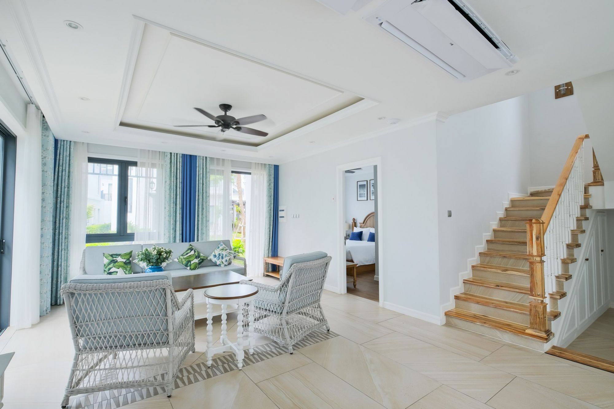 Tổng thể Villa 2PN thuộc Sunset Sanato Resort & Villa được thiết kế theo tinh thần mở, nơi ánh sáng tự nhiên trở thành yếu tố dẫn dắt toàn bộ không gian. Tông màu sáng, vật liệu nhẹ và cách bố trí thông thoáng giúp villa luôn giữ được sự tươi mới suốt cả ngày. Từ phòng khách đến phòng ngủ, các ô cửa kính lớn mở ra khu vườn và khoảng xanh, tạo cảm giác như đang sống giữa một khu nghỉ dưỡng ven biển thu nhỏ.