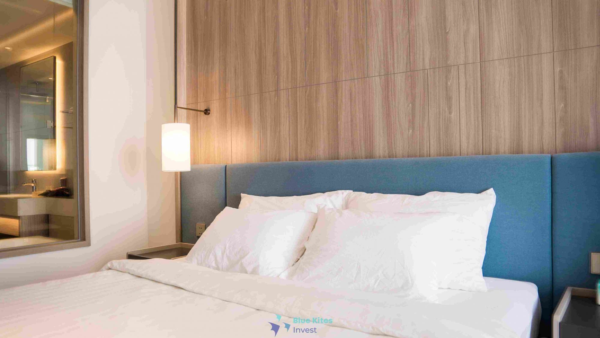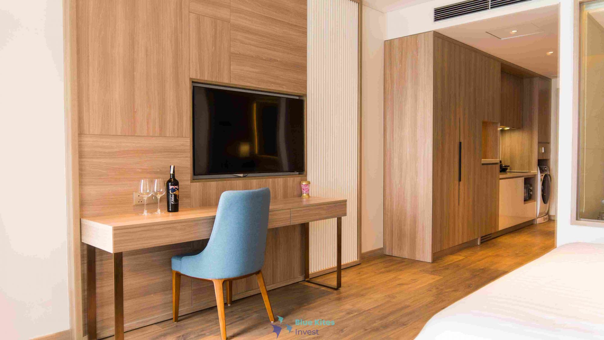 Phòng nghỉ hiện đại: Các căn hộ được trang bị đầy đủ điều hòa, bếp tiện nghi (có tủ lạnh, lò vi sóng, ấm đun nước) và TV màn hình phẳng.