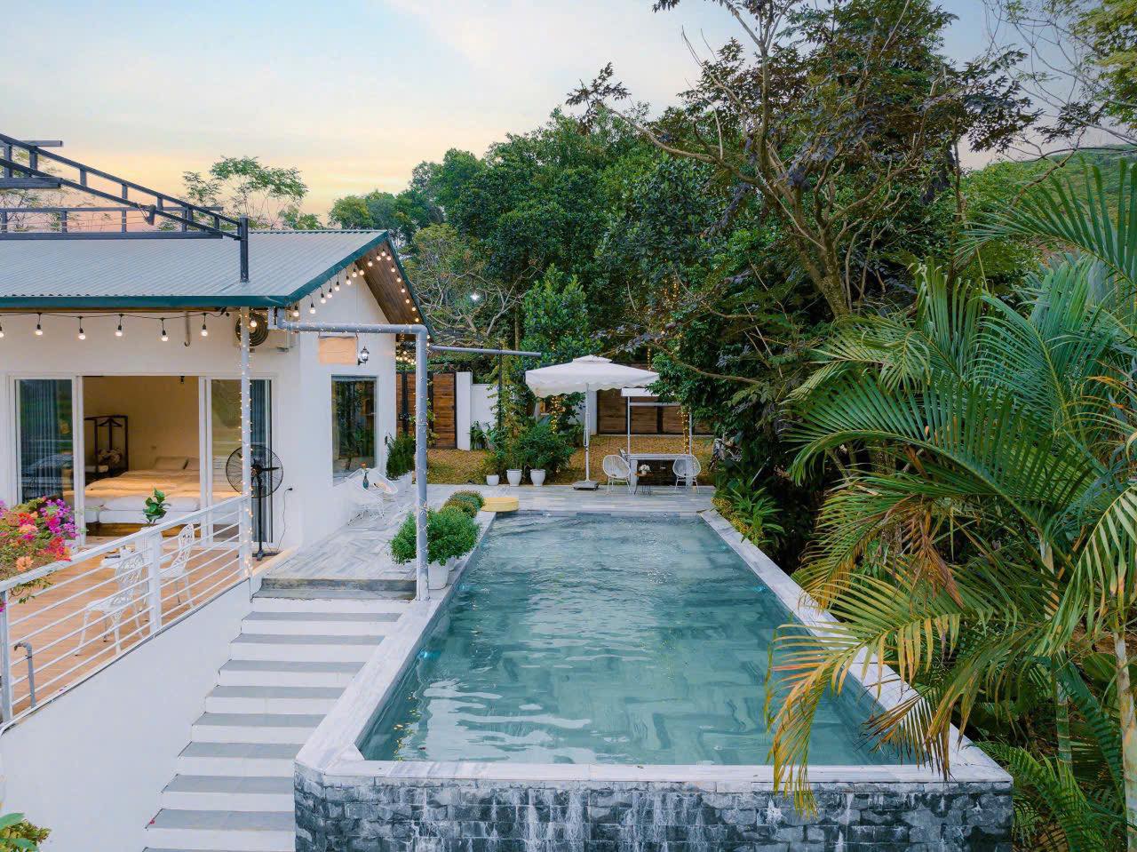Điểm nhấn không thể bỏ qua chính là bể bơi rộng 50m², xanh mát và sạch sẽ, phù hợp để thư giãn, chụp ảnh hoặc tổ chức các hoạt động bên hồ cực vui.